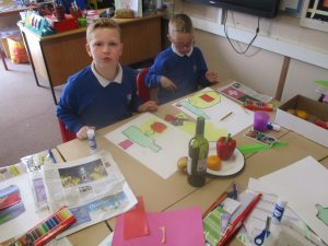 Our visitor, Kate, showed us the shading techniques of still-life artist Paul Cezanne. She demonstrated how to use coloured paper to create the fruits, bottles and other objects. Kate also showed us how, by using a black outline, we can make these other colours look brighter.