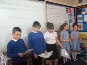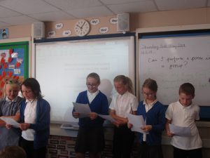 This week the year 5 children have enjoyed exploring poems which are written to be performed. A particular favourite was Walking with my Iguana by Brian Moses! We looked at different language features found in these poems such as onomatopoeia, rhyme, rhythm, language play and humour. At the end of the week, groups performed their favourite poems to the rest of the class and were given positive feedback on their performances.