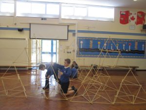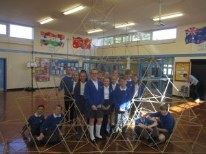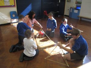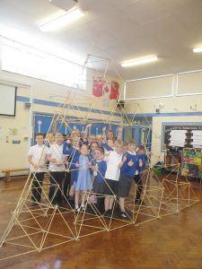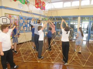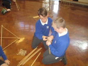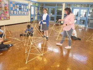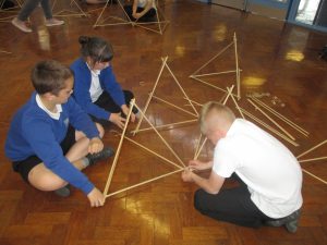 Today the Elms, Oaks and Beeches had an excellent session with Wilmont Dixon turning canes and elastic bands into mini tetrahedrons. We then connected all the mini tetrahedrons together and created a tremendous tetrahedron, which towered over everyone.