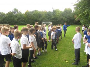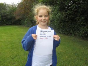 As part of our ‘Survival of the Fittest’ topic, the children had to understand the concept of time from 5 billion years ago to present day! A very difficult concept indeed, so we all decided to make a human timeline instead of just looking at pictures on a computer screen or printout. We had to use our maths skills to work out a ratio from years to metres. Then we had to measure it out using a trundle metre wheel. The children had information sheets with key events in time on them. It really helped us to understand and appreciate to how little time humans as we know them have lived on our planet…and just how long our planet existed with no life at all.