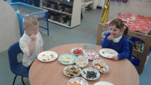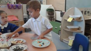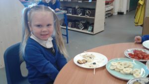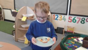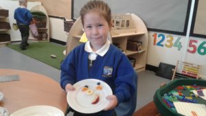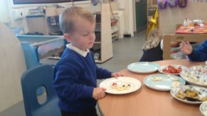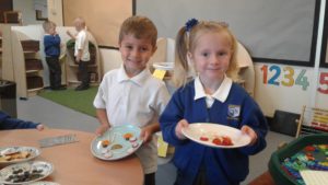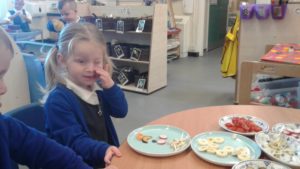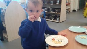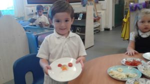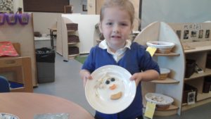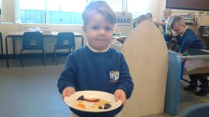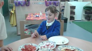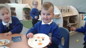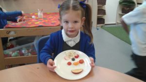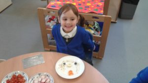 To continue our theme of ‘All about us’ in nursery, we made some more self-portraits. This time, instead of paint, we used a variety of salad and fruit. The children looked in a mirror, talked about their features, selected appropriate items and then arranged them on a plate. The children thoroughly enjoyed eating their self-portraits afterwards!