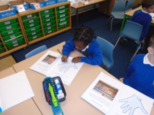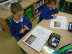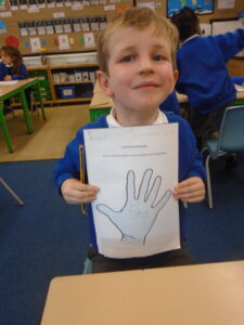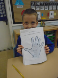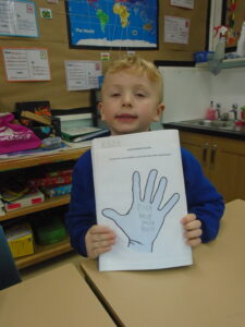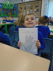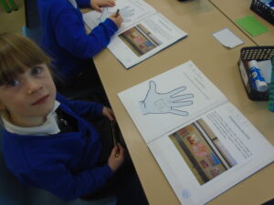 We then looked at how we can be a good friend. First we wrote four things on our friendship palms that make us a great friend. We thought of lots of different ideas as we are all wonderful friends!