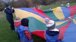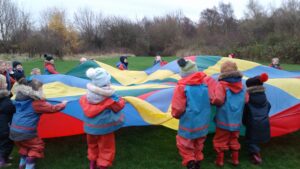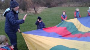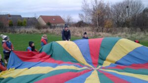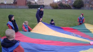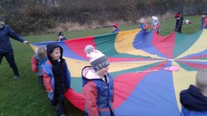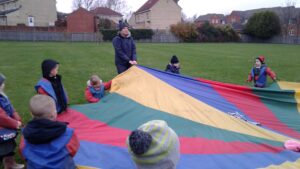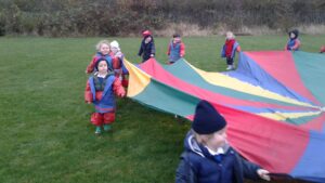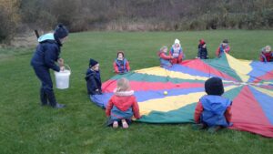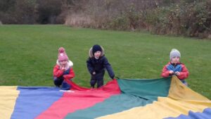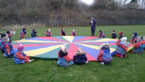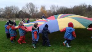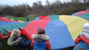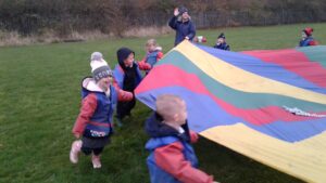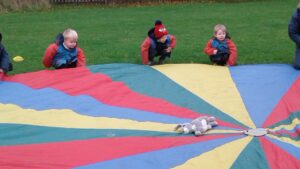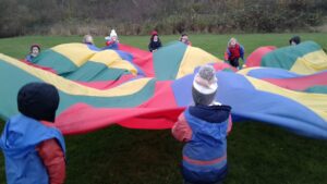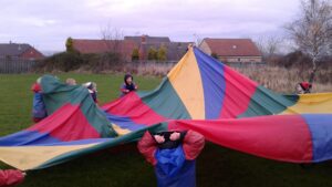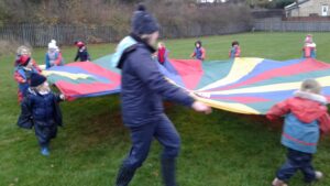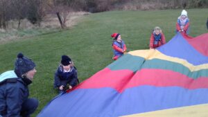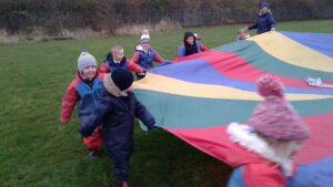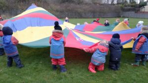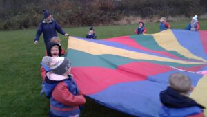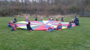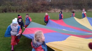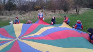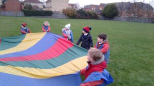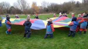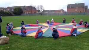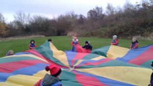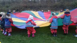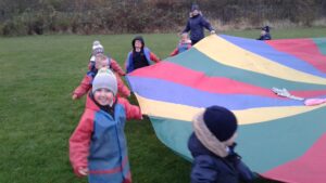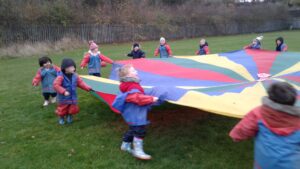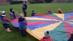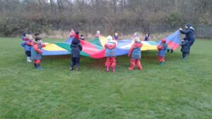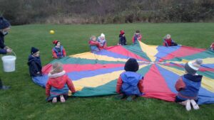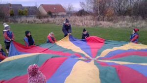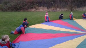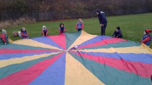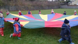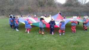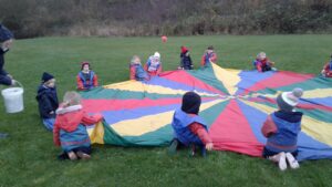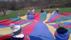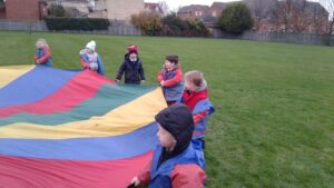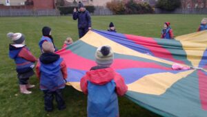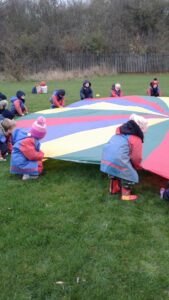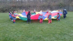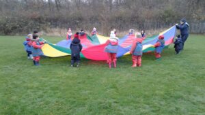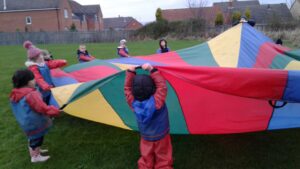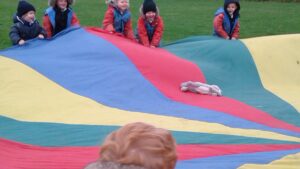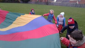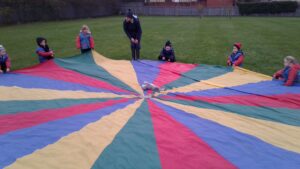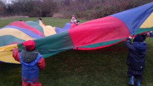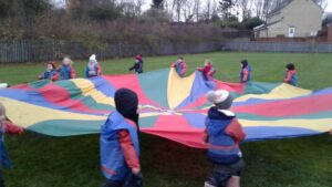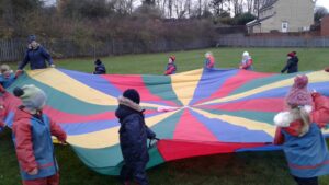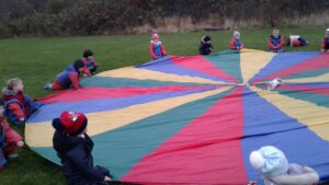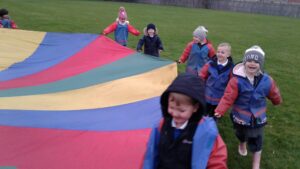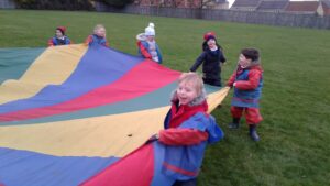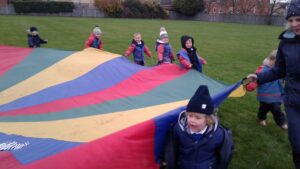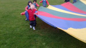 We have had a super day outside working as a team while playing parachute games. We used our imaginations to pretend the parachute was a washing machine and it was washing some clothes, which were placed on top of it. We walked and ran around in a circle to simulate the washing machine spinning and then we moved the parachute up and down to ‘dry’ the clothes in the wind. We placed some balls on top of the parachute and then flipped it to see how many we could make fall off. We counted the balls on and off and tried to beat our score each time. We also sang, ‘See the Little Bunnies Sleeping’ while moving the parachute to ‘wake up’ a soft toy rabbit at the appropriate time in the song. Fun was had by all!