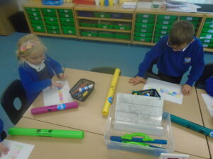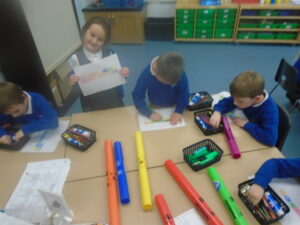 The Robins have continued to play the boomwhackers in class. This week we explored pitch a bit further and created our own songs using patterns. The children created their own songs and had a lot of fun playing them in class. We have also began creating our calendars to bring home, using shape and colour in the style of Paul Klee. Its been a busy week but we have had a lot of fun!
