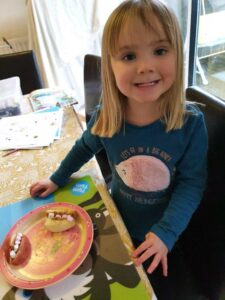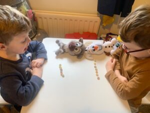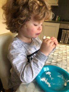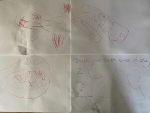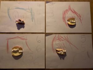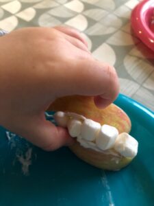 We have continued our theme of key workers/super heroes this week and focused on dentists. We found out what happens at the dentists via stories and videos and we also made some lips and teeth with apple slices and mini marshmallows. We had fun counting the marshmallows/teeth and also eating them!