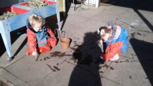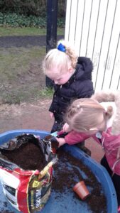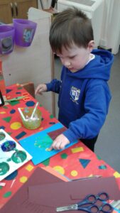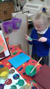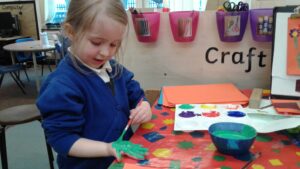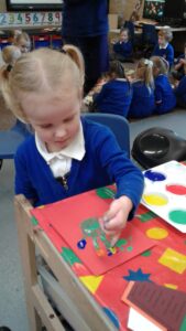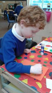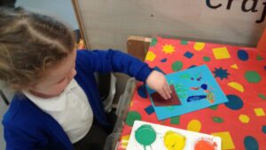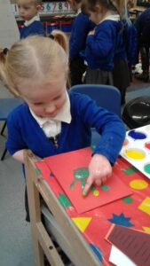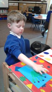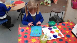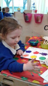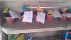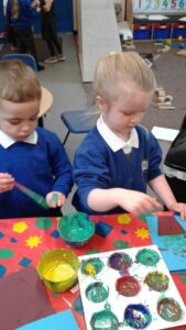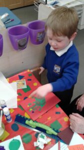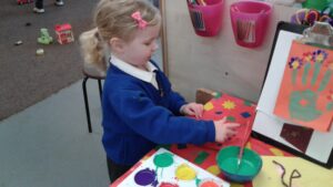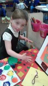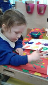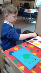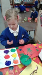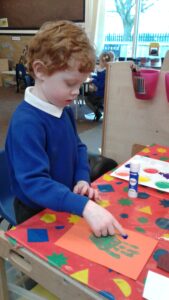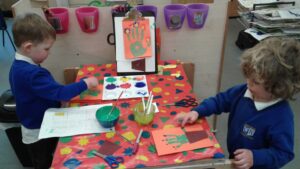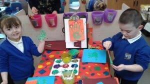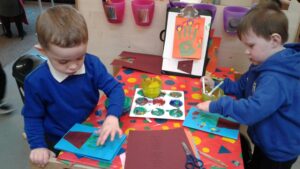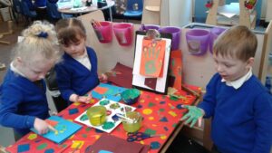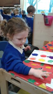 This week, we have focused on the book, Ten Little Seeds by Ruth Brown which is about ten sunflower seeds and what happens to them. We planted some sunflower seeds which we are hoping to re-pot outdoors when they have grown into seedlings. Keeping the sunflower theme, the children made a pack containing a sunflower growing kit for their mam/special person for Mother’s Day and also a beautiful card featuring some flowers which were created using a hand print and finger prints.