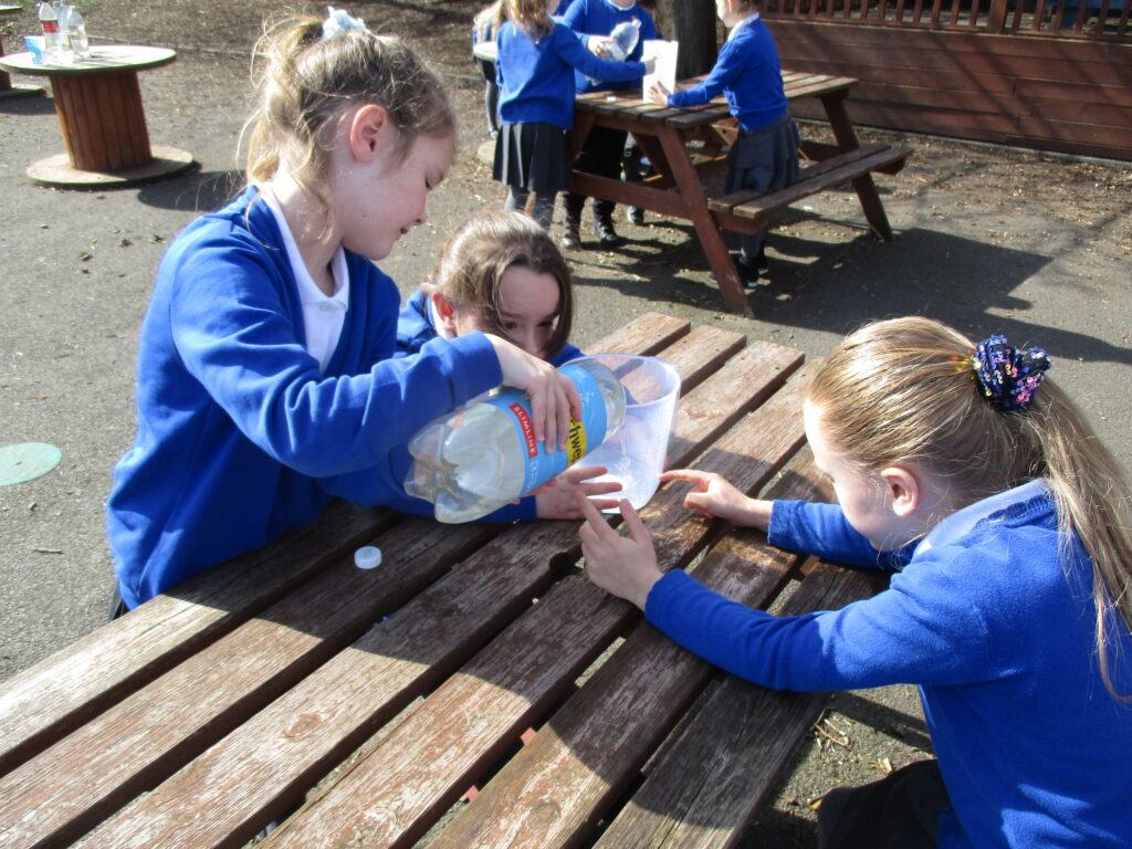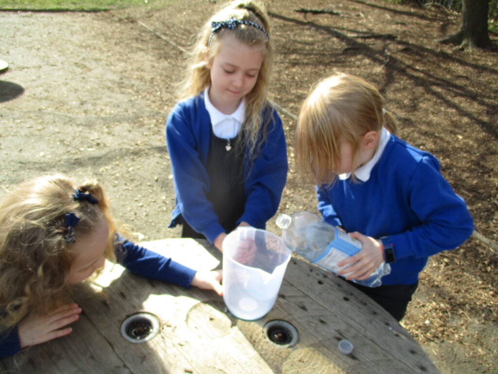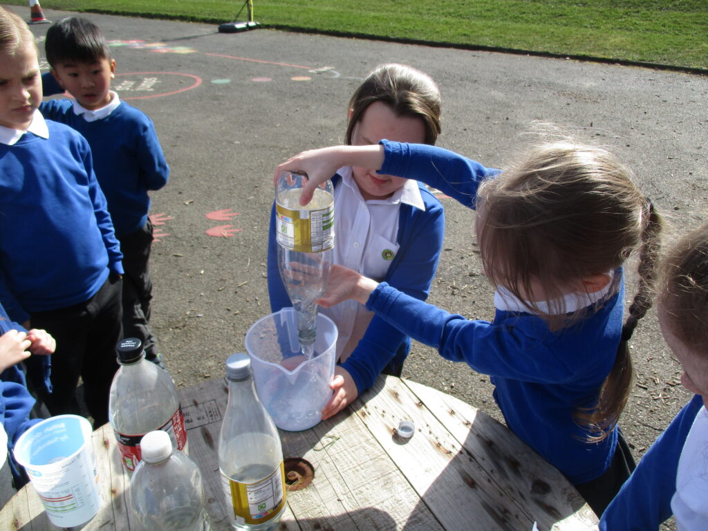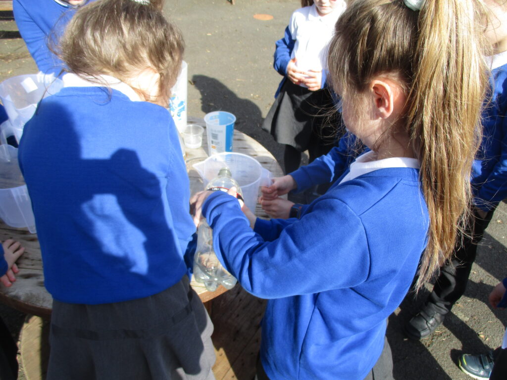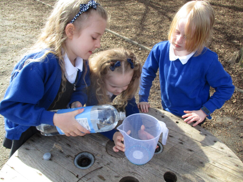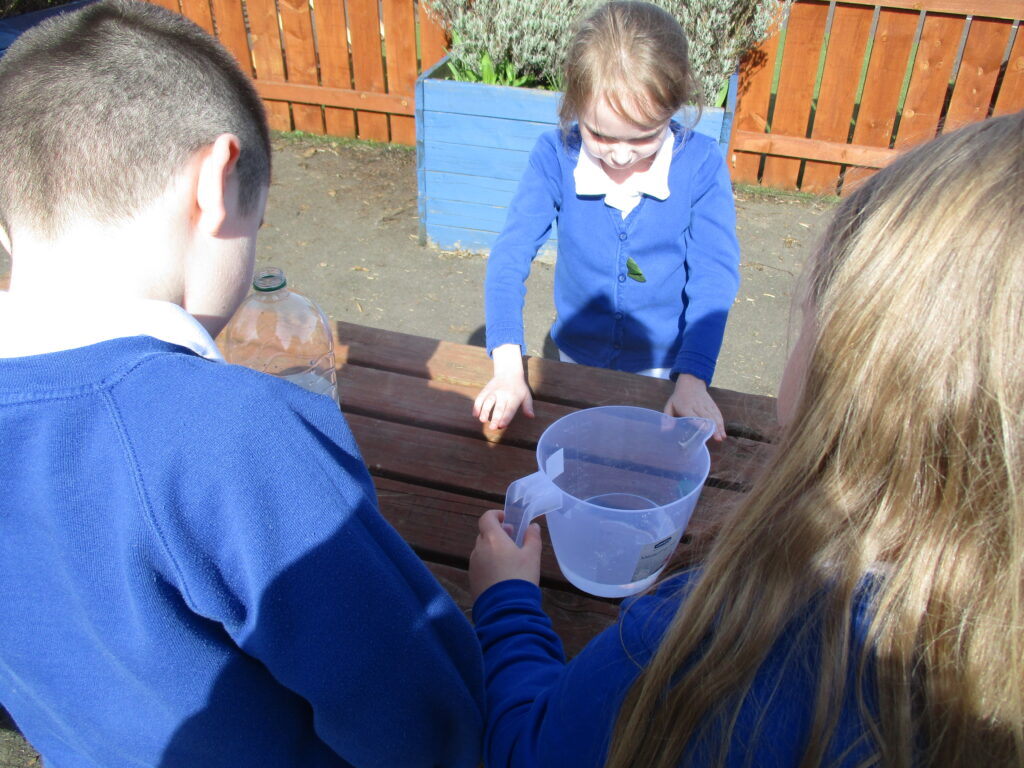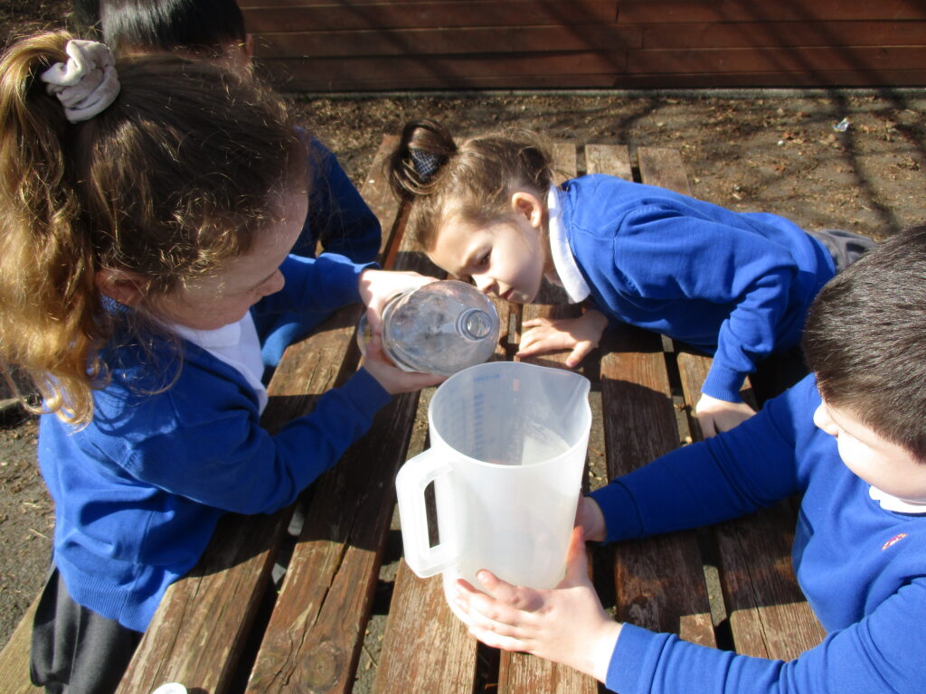 This week in Year 2, we are looking at measuring volume and capacity. Today the children were introduced to the topic through a fun super movers video about how to measure liquids. We then went outside, where the children worked as a team to measure different amounts of liquid. They were careful to make sure they were accurate with their measurements and read the scale correctly. We then took part in an estimating task where children had to guess how much was in different containers. The children had a lot of fun having our maths lesson outside, especially with the weather being so lovely!