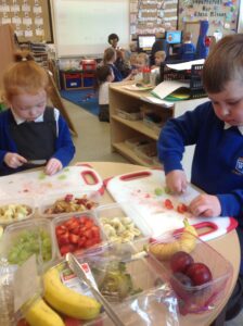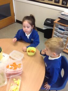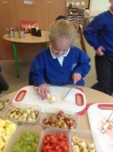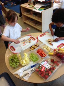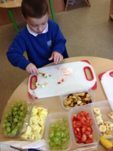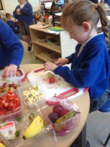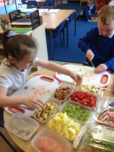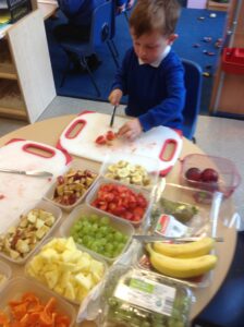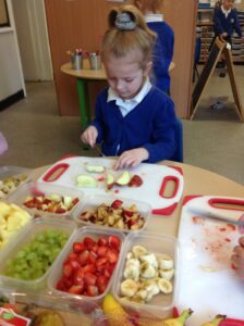 The children have been reading ‘Oliver’s Fruit Salad’ story by Vivian French. They thoroughly enjoyed the story and shared their own experience of growing fruit and naming fruit. The children then made a shopping list ready for their tasting session. On Friday, the children explored different fruit and helped prepare them ready for our tasting session. The children all used the knifes safely and with good control. We then placed all the different fruit into small pots to share. The children tried banana, strawberries, grapes, oranges, pineapple, apple, pear and plums. We discussed the taste, smell, shapes, colours and texture of each different fruit. We discussed our favourite fruit and recorded the results on a tally chart. The children then converted the results from the tally chart onto a pictogram.