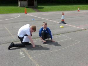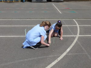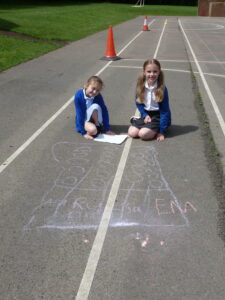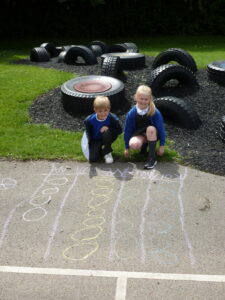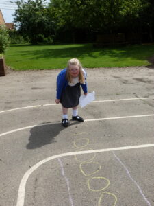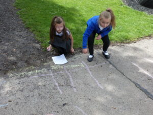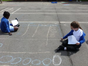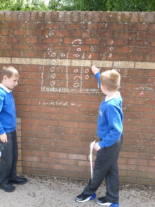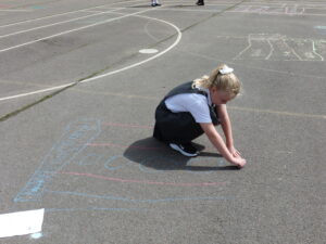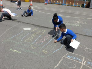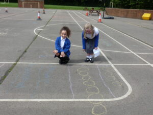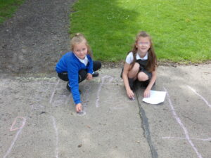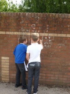 This week, Bluebells have spent some time outdoors working to do their maths. Children particularly enjoyed learning about how pictograms can be used to display data. We took to the KS2 yard, chalk in hand, to decorate the playground with Pictograms showing the number of goals scored by top strikers and the number of house points won in school.