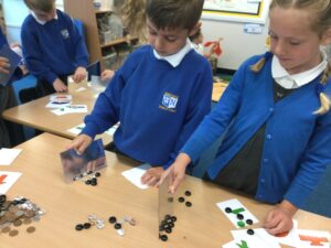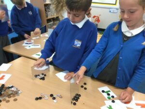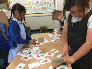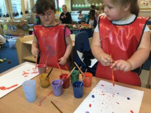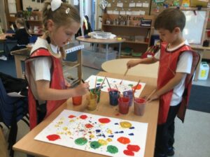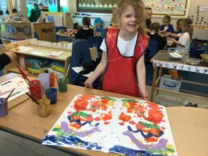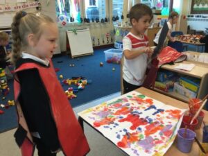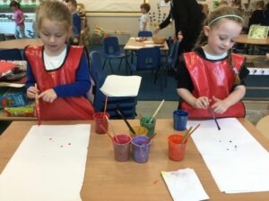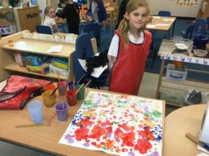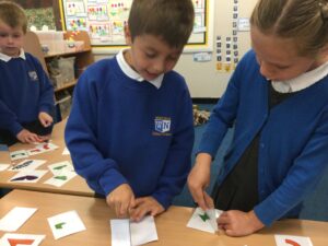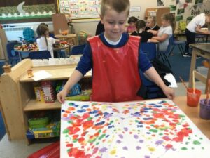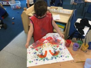 The children have explored symmetry. They have used half shapes to make a whole, before making their own symmetrical patterns. The children were amazed and very excited when they revealed their own beautiful symmetrical butterflies created by splatting paint. There was lots of mathematical discussion about what made their creations symmetrical.
