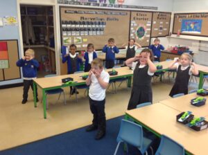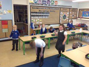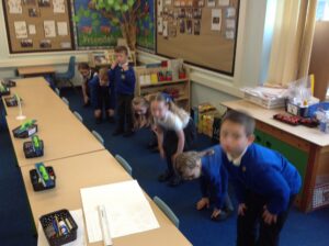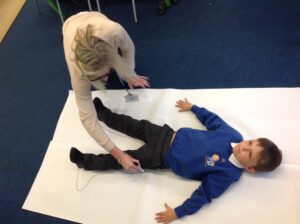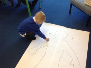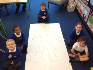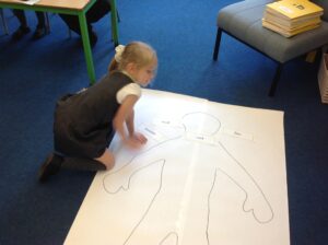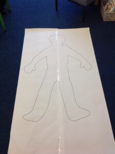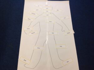This week in Science the children have been looking at the body and the different body parts. We started off the lesson dancing to head, shoulders, knees and toes. We drew around a member of the class to get a body shape template and then used word cards with different body parts on to correctly locate them on our body template.
