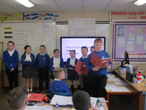Over the past few weeks, Year 5 have been writing a number of balanced arguments and have become experts on a range of topics. Today we put their learnt skills to the test and took part in group and class debates. The children decided between two questions to discuss: ‘Should everyone now have electric vehicles?’ and ‘Should school uniforms be banned?’ They showed successful listening and turn-taking skills and conducted a great debate!