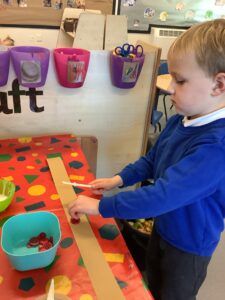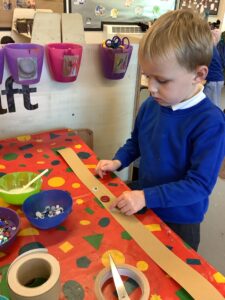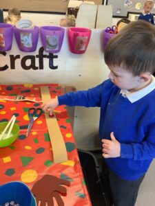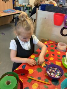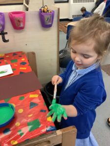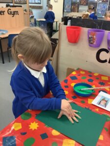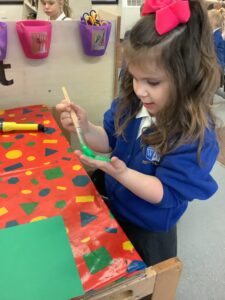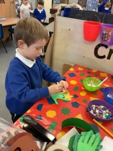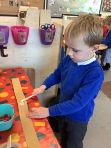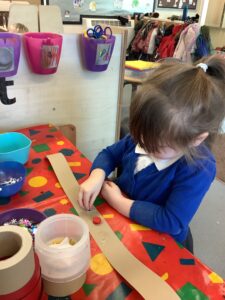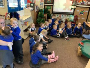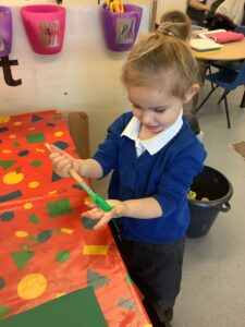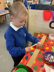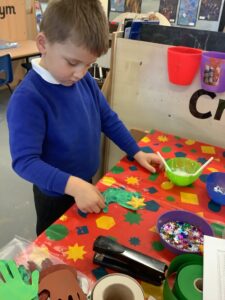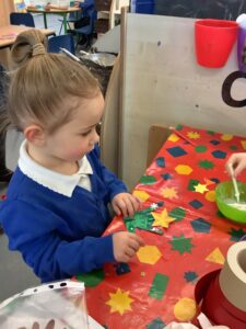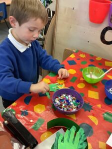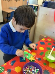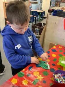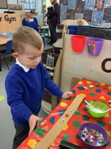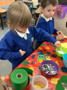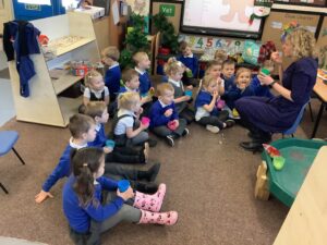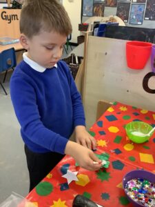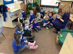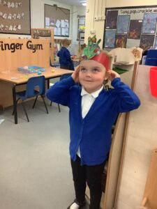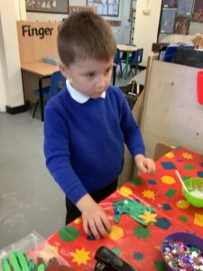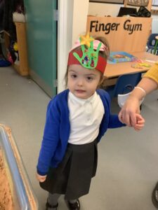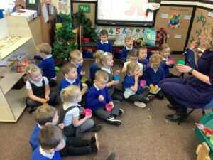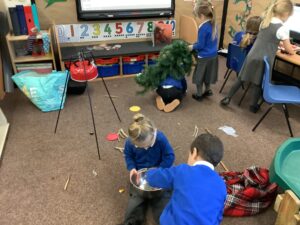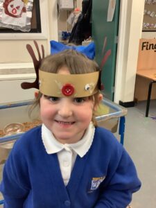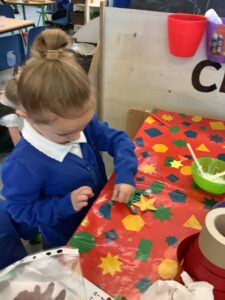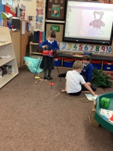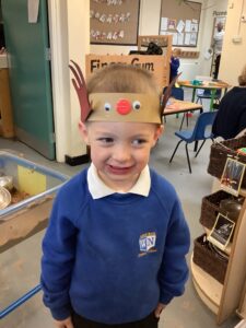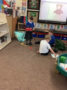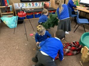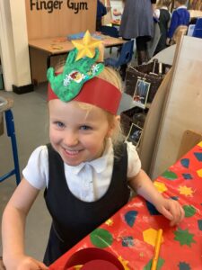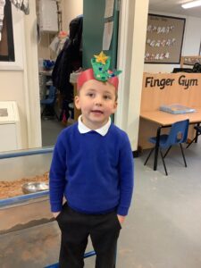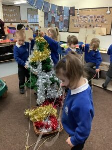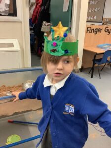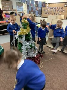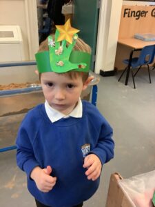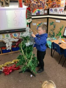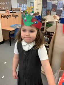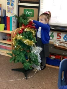 To introduce the Christmas season, we have focused on the story, Bear Stays Up. We have had great fun using props to act out the main parts of the story, making pop corn, making bear faces with brown play dough, creating bear pictures on the computer and searching for evergreen trees in our school grounds. We thoroughly enjoyed decorating a Christmas tree with tinsel and strings of beads. We also made some super hats which we will wear for our Christmas performance next week.