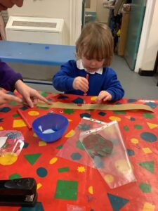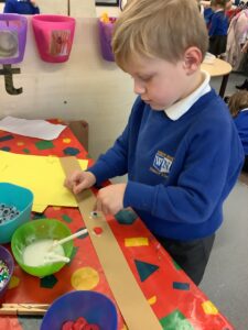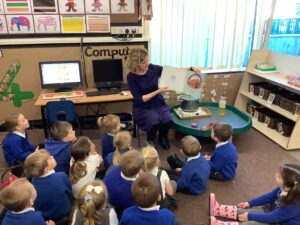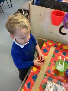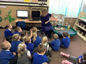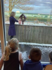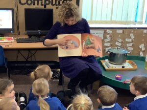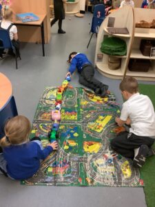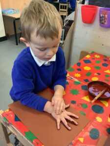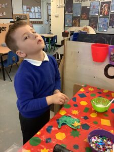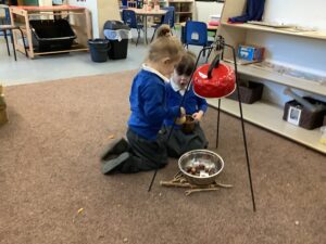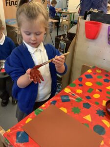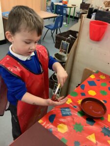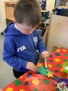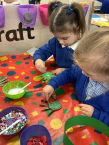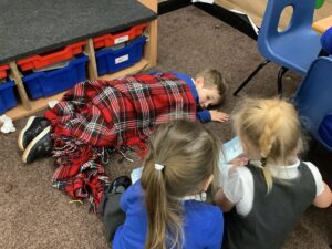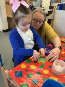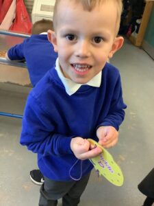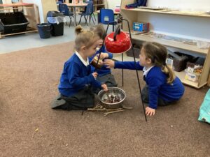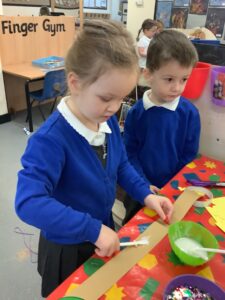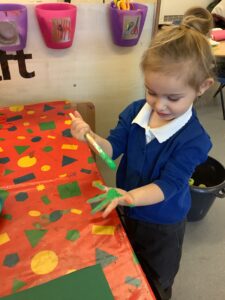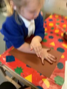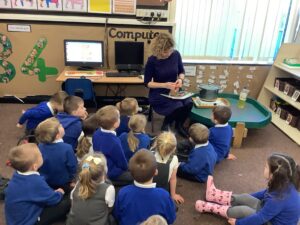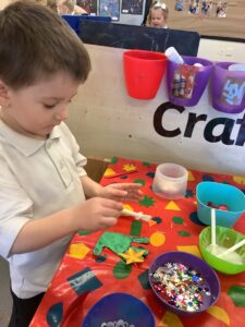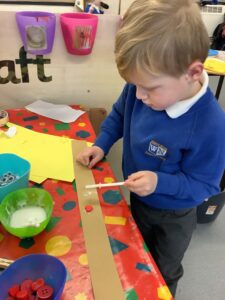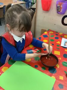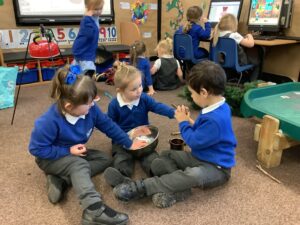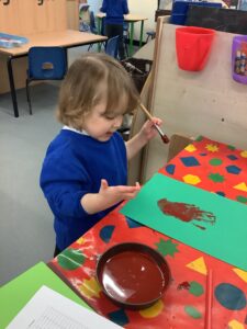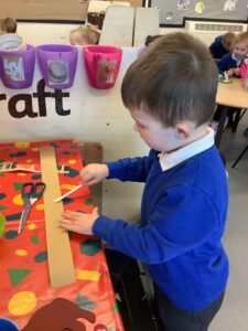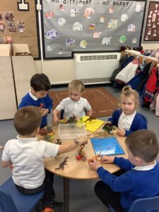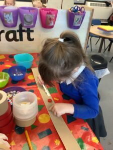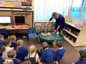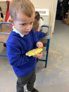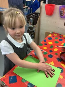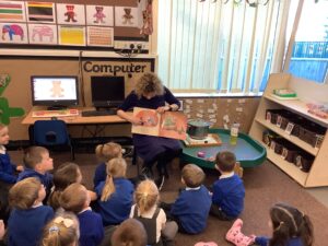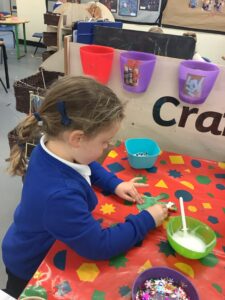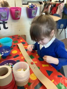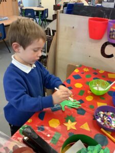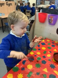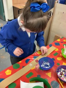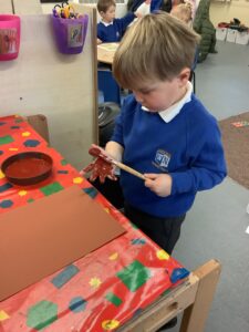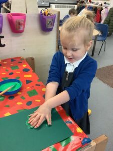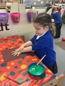 To introduce the Christmas season, we have focused on the story, Bear Stays Up. We have had great fun using props to act out the main parts of the story, making pop corn, making bear faces with brown play dough, creating bear pictures on the computer and searching for evergreen trees in our school grounds. We thoroughly enjoyed decorating a Christmas tree with tinsel and strings of beads. We also made some super hats which we will wear for our Christmas performance next week.