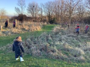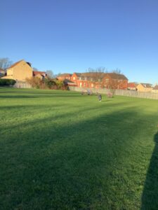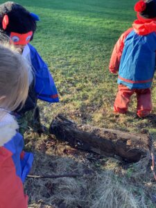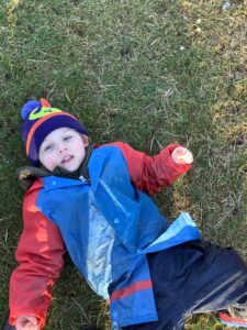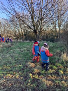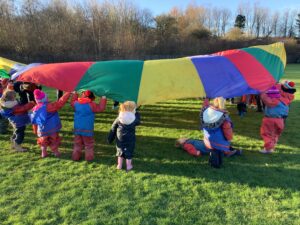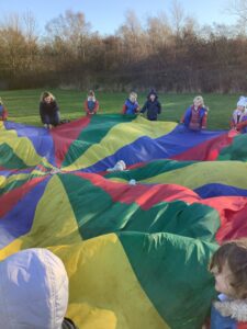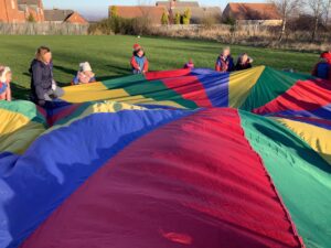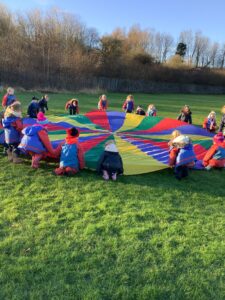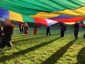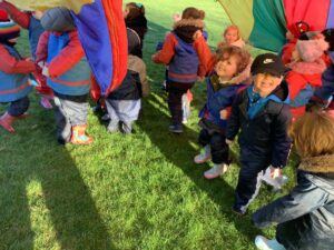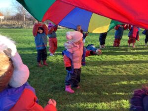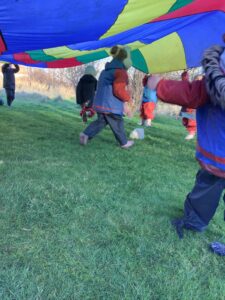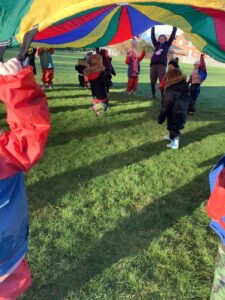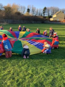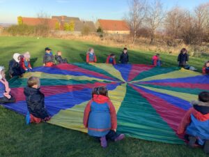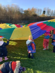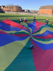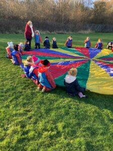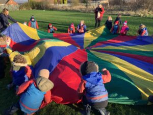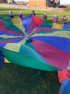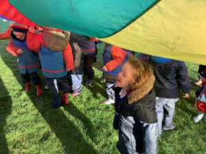 We had great fun today outside using a parachute and exploring our school grounds. We discovered a small patch of frost on the grass during our exploration. We experimented with it by holding some blades of grass in our hands and watching the frost melt. We discovered that when we first picked up the frosted grass it was hard and then when it melted it felt softer and it was wet.
