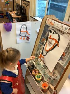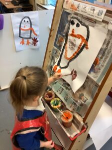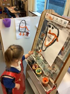 We have been focusing on the story, Penguin and Pinecone which is a wonderful story about friendship and the contrast between Winter and Summer weather. Thinking about the story, we have worked on being good friends as well as discussing the different climates featured within the book. We also retold the book beautifully using some props. We started painting and drawing the characters from the story which will be displayed on the wall when we have finished.