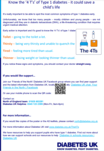 Diabetes UK are running a campaign across the North of England to increase awareness of the signs and symptoms of type 1 in children and young people. The attached poster gives information on what to look out for.