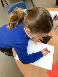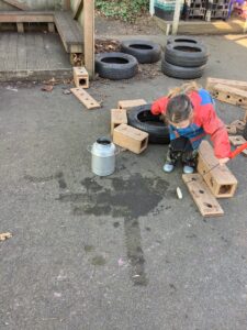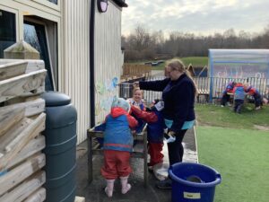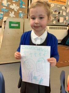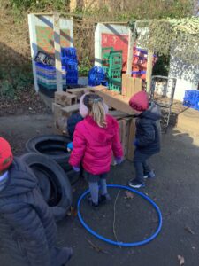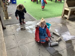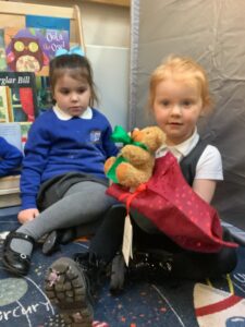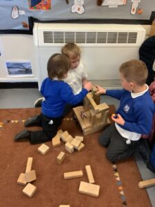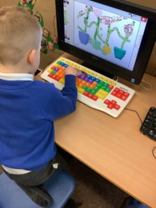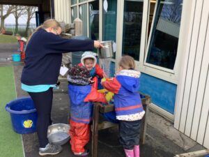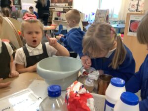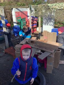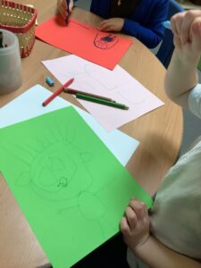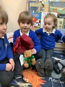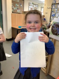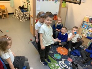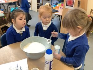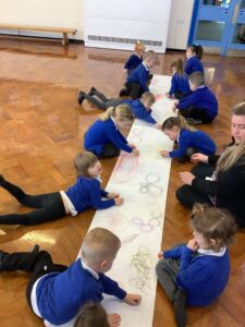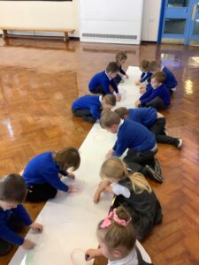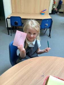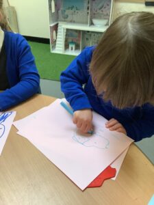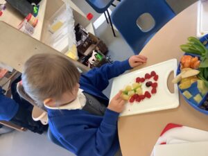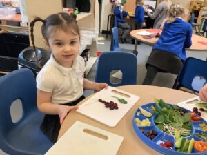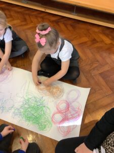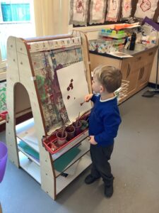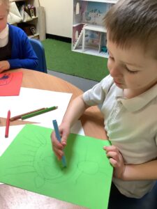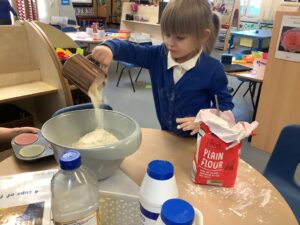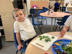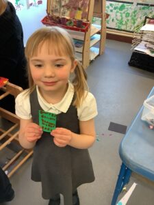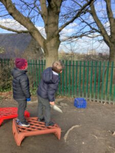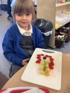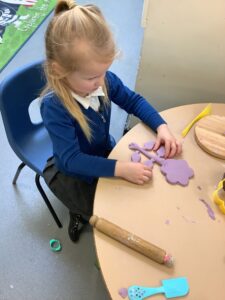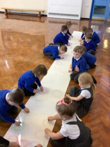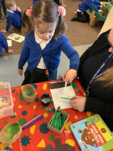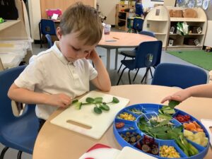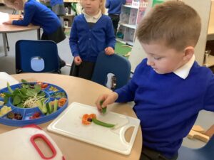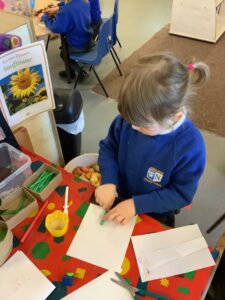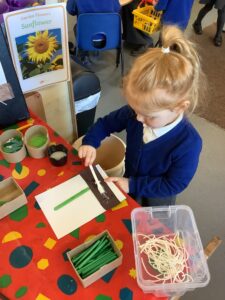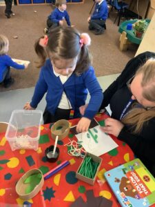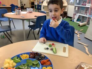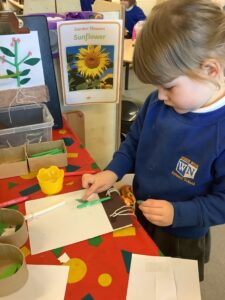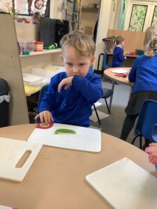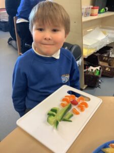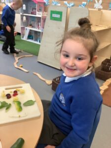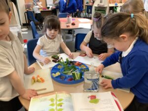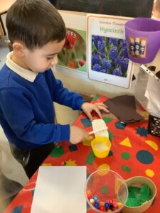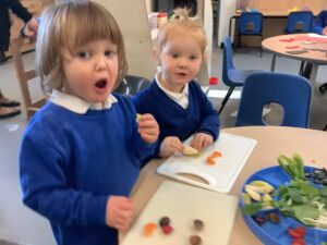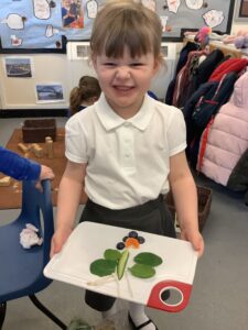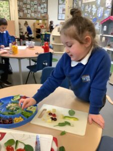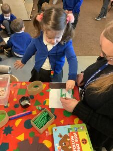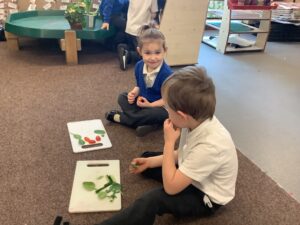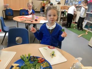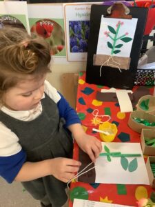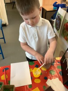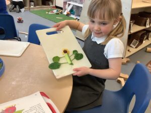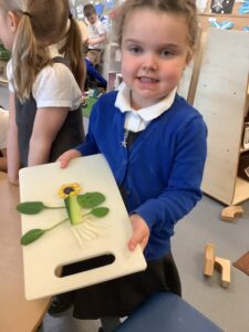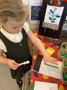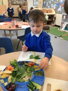We have continued our plant topic this week. We finished off making some plant collages to show the structure of a plant which have been displayed in nursery and look fabulous. We made some fantastic edible plant collages using a range of salad and fruit. It was wonderful to observe some of the children trying food that they hadn’t tried before. For our maths session this week, we worked on preposition and used News Ted to sit beside, under, in front, on top, behind and in a bag to help us. We had great fun in phonics making, ‘rhyming soup’. We sang a song about cooking silly soup in the fridge, which made us laugh and added a pair of rhyming items into a pan/dish while we took turns stiring it. We also participated in Squiggle While You Wiggle and we made our own play dough. During our outdoor Friday session we made plant collages using our large construction equipment.
