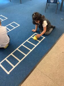 We focused on moving the Bee-bot forwards and backwards using the arrows, giving the Bee-bot instructions. We predicted how far the Bee-bot would need to move to reach our friends, the children worked fantastically together. Next, we used our counting skills to move the Bee-bot forwards and backwards up the ladder and used our Bee-bots to make our own maps!