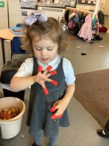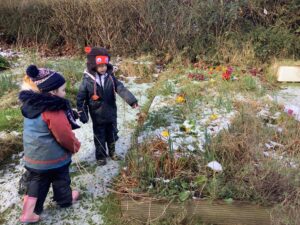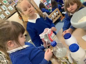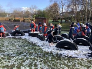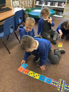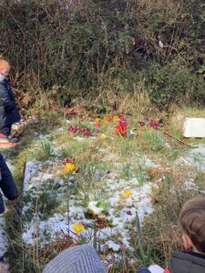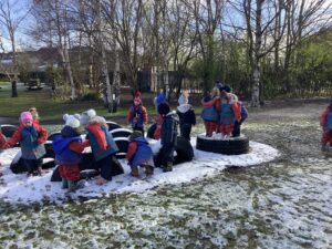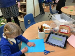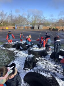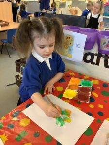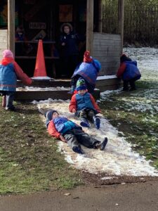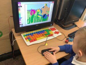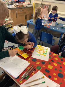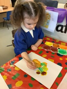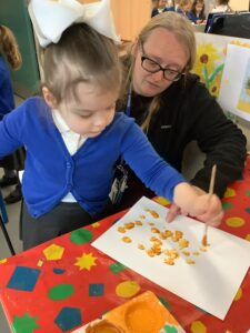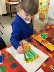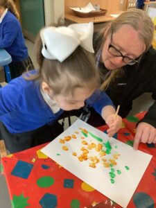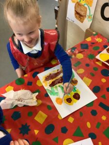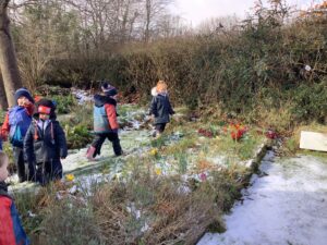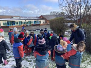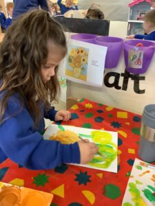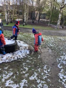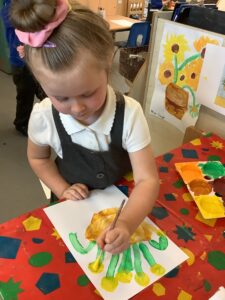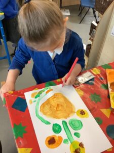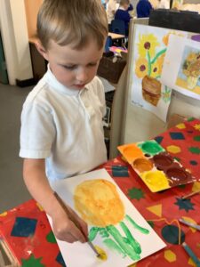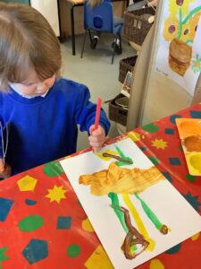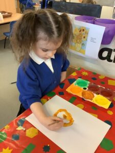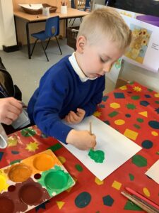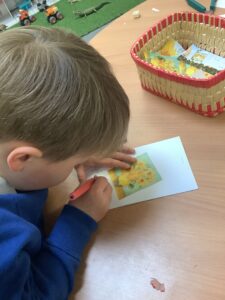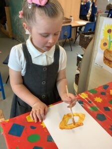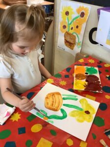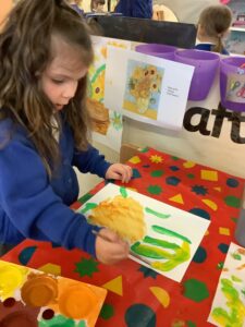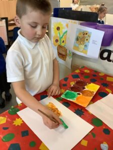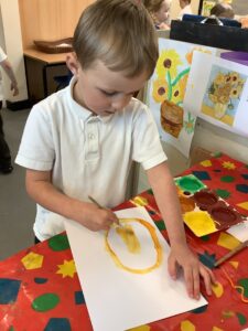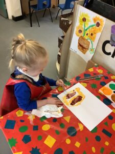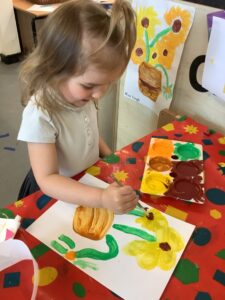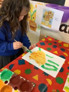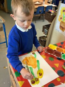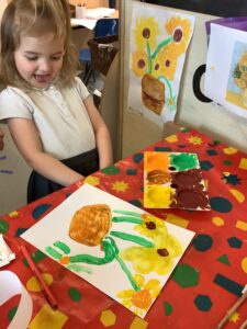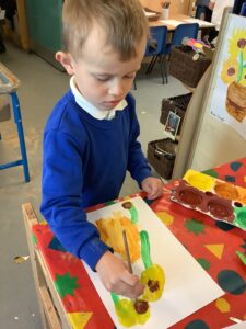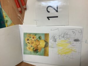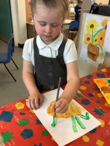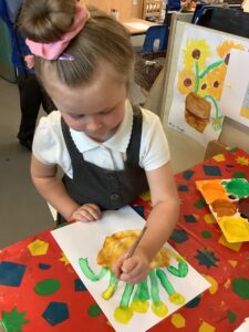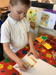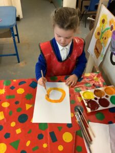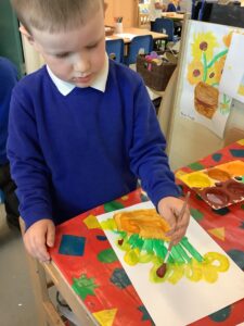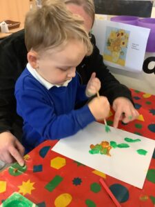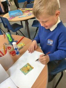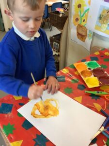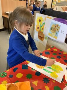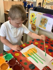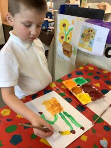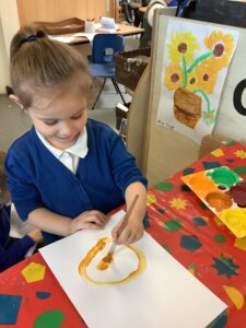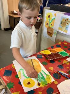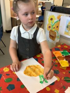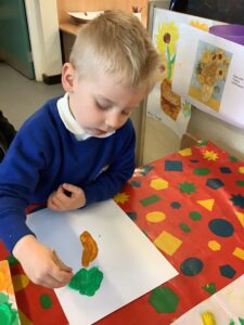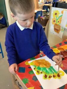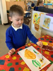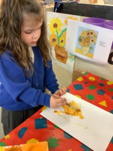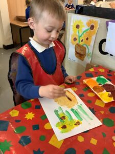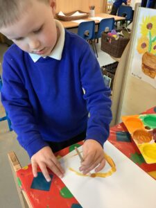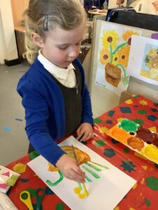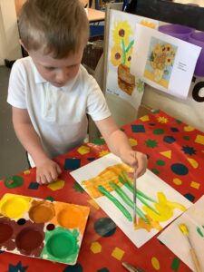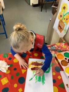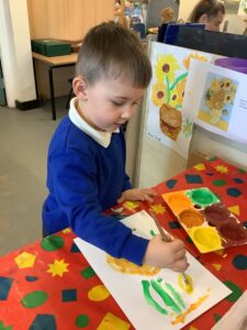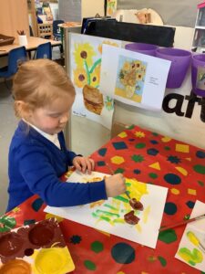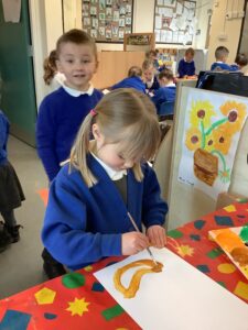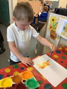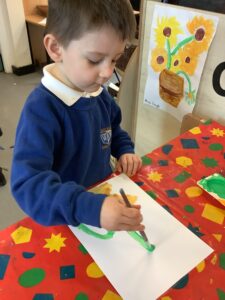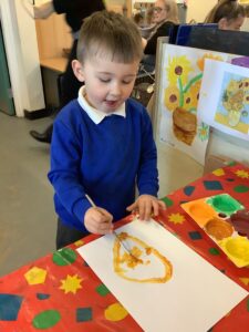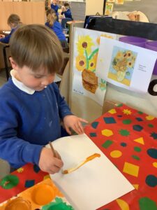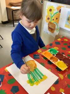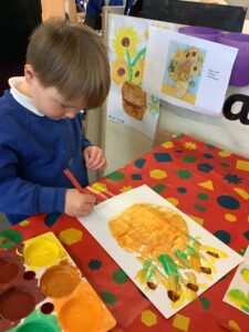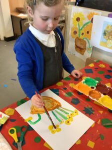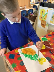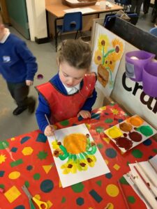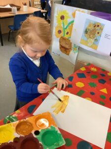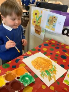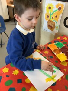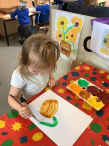 This week we have continued our plant/flower theme and focussed on Vincent van Gogh’s Twelve Sunflower’s in a Vase. We produced some stunning paintings of sunflowers as well as making booklets and drawings. In maths we played dominoes to improve our subitising skills. We practised sounding out words again in phonics using robot arms. We produced some spring garden pictures on the computer and some us us had a trip to the photocopying room to collect our pictures. During our Friday outdoor session we looked for signs of Spring in the snow! We talked about typical Spring weather and how unusual it was to have snow on April 1st! Our science focus included discussion and examination of the snow and the effects that the sun has on it. For example, we noticed water dripping from the school roof and some puddles where the sun had thawed the snow.