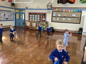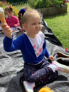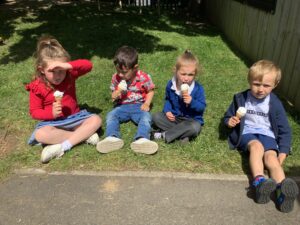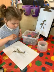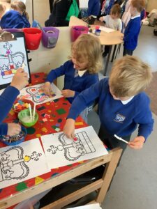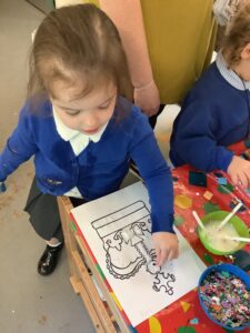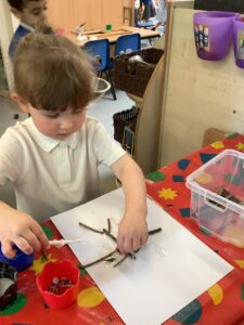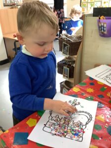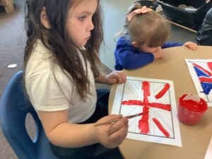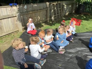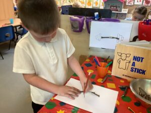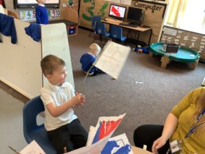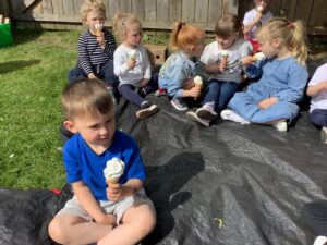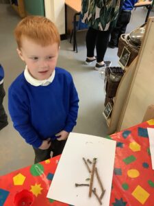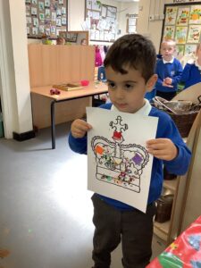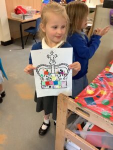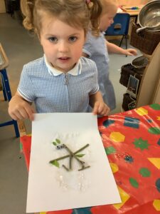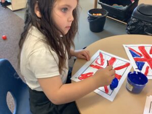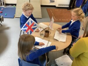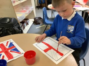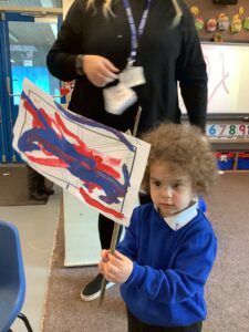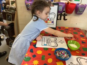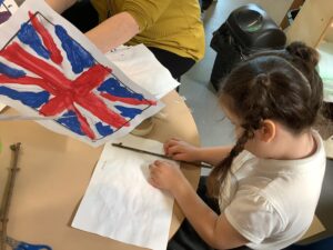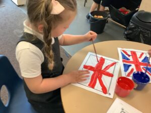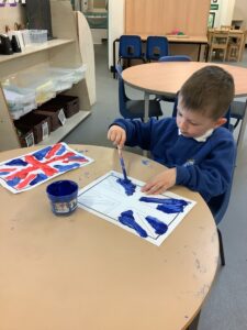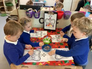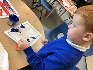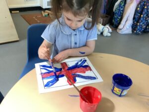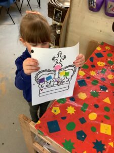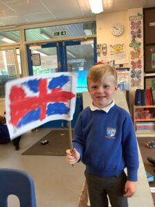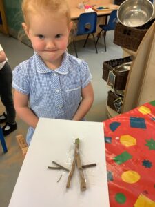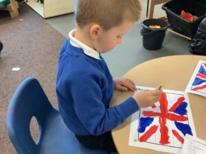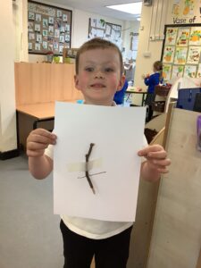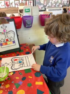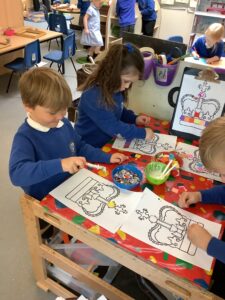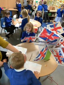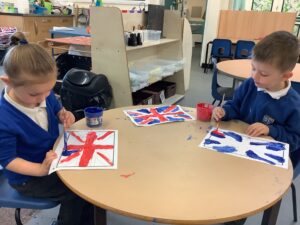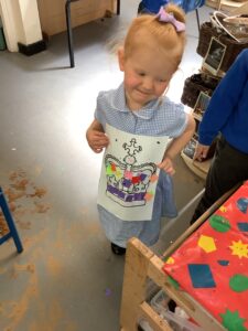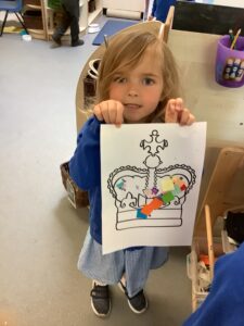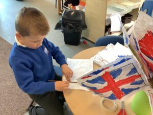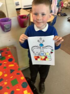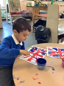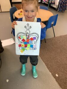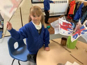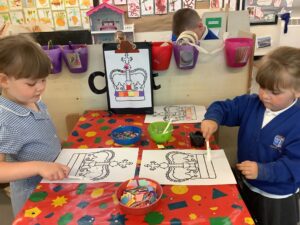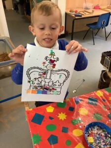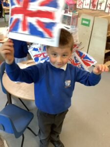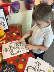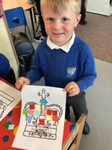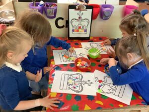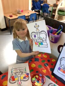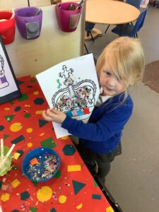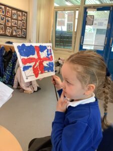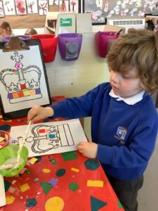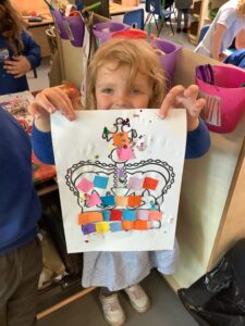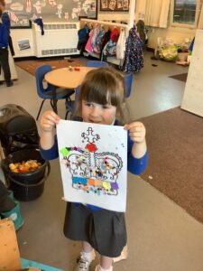 We have had another super busy week! We finished our Stick Man artwork and computer pictures as well as our usual tasks like, making play dough and participating in Squiggle While You Wiggle. We used our play dough to form some numbers as well as making Stick Man and his family tree. To commemorate the Queen’s Jubilee, we all made some fabulous crowns to wear and parade in front of the whole school. We also painted Union Jack flags and used real sticks as the mast/handle which we obtained during a stick hunt. We discussed the part in the Stick Man story when Stick Man says, “I’m not a mast for a silly old flag!” and acted out scenes from the story with our sticks. We all thoroughly enjoyed eating an ice cream from the visiting ice cream van and the children who stayed for lunch ate their food outside picnic style! A great day all round!