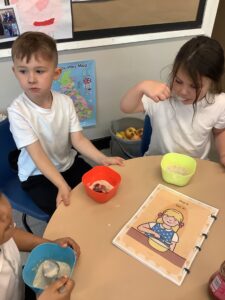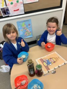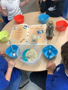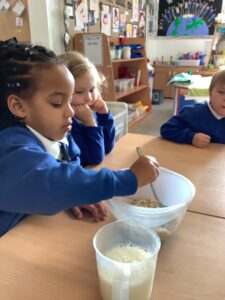 We were interested in what the porridge may have tasted like; first we found out how many people thought they would like porridge, we discussed the ingredients and equipment we would need and then worked as a team to stir the porridge to the right consistency, we made sure it was cool enough then ate it all up!