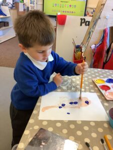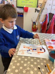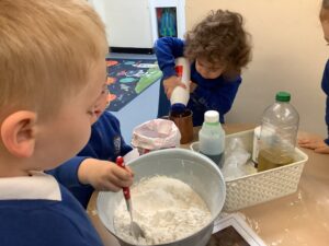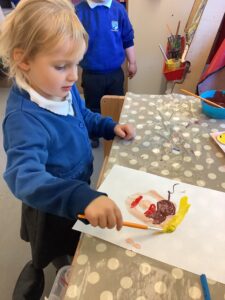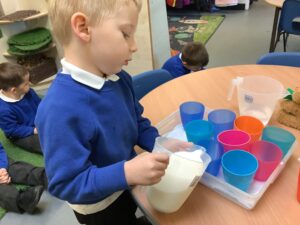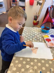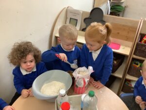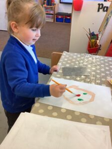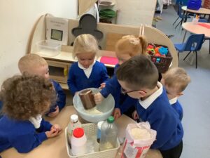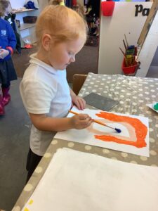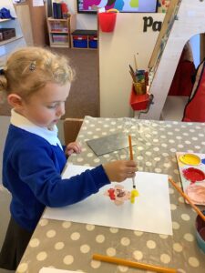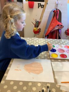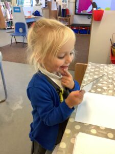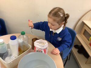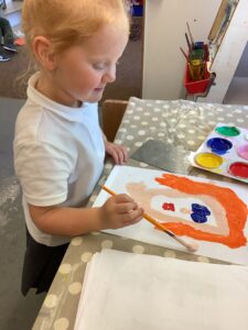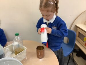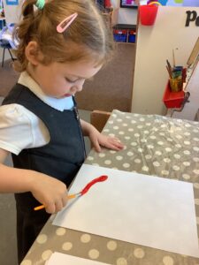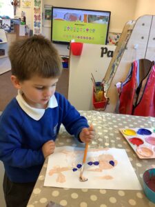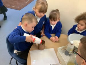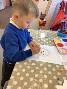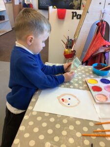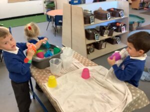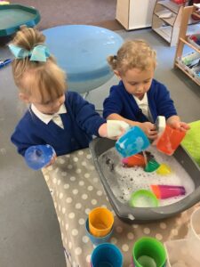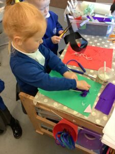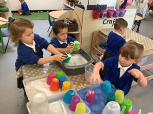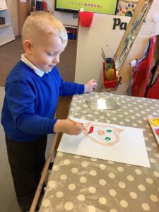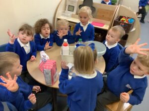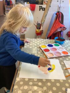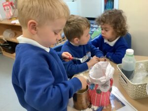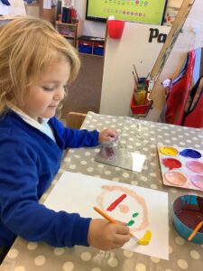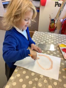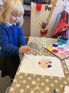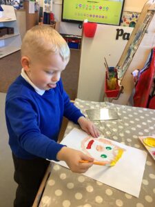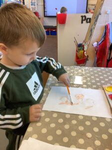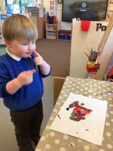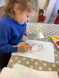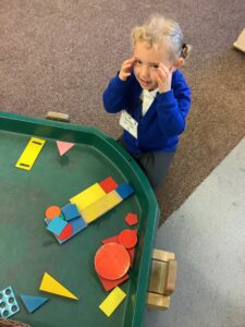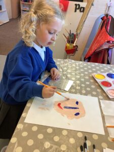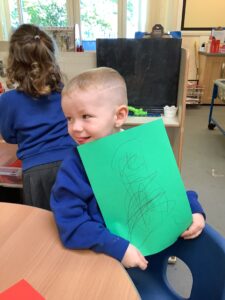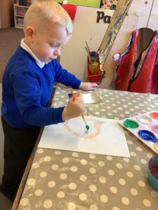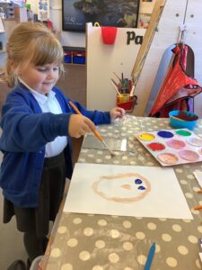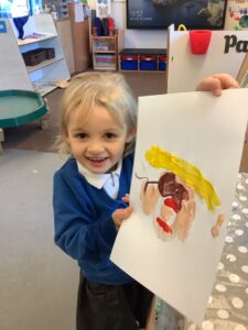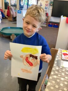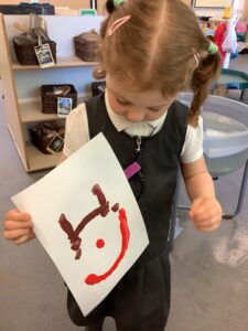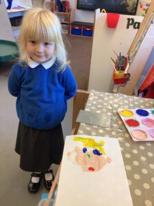 This week in nursery we have focused on ourselves and completed some beautiful self portrait paintings. We have continued to focus on maths, literacy, ICT, speaking and listening skills, independence, problem solving and physical development during ‘Special Helper’ activities. We are delighted to see how much the children’s confidence and skills have developed in such a short amount of time. During our Friday outdoor session we experimented with a variety of materials like; pasta, rice, water, dried spices. We put the materials into bottles to make shaker instruments to use on our outdoor stage. We also made a campsite/fire circle and sat around it to sing the songs that we have learned so far this half term.
