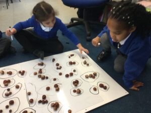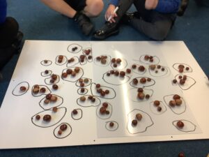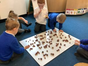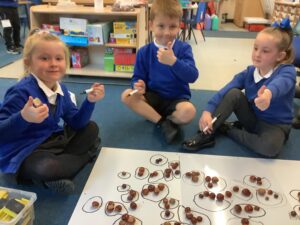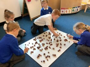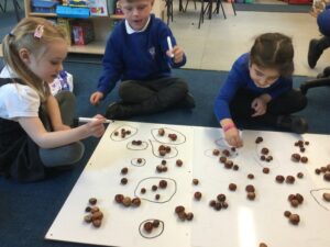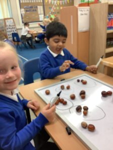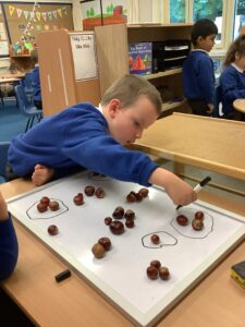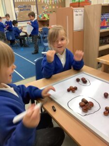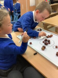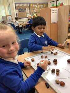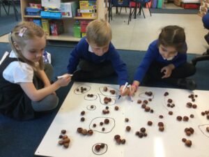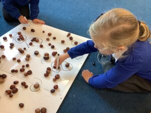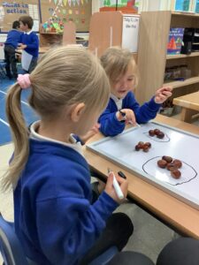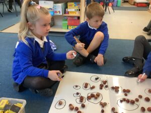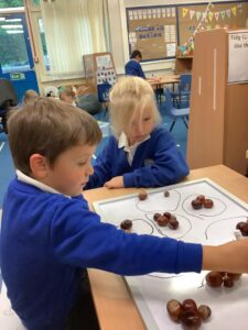 This week, we have been looking at subitising and counting numbers accurately. We created counting wands which helped us count larger objects and things that cannot be moved. During group time, we looked for patterns of subitising and drew around conkers to show representations of 1,2 and 3 without counting.