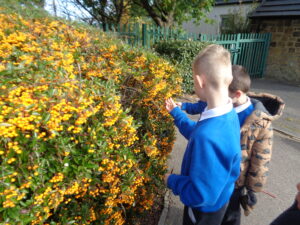 This week Year 2 have been exploring the school grounds searching for signs of autumn. We have discovered lots of things such as apples, changing leaves and berries. We thought about the adjectives we could use to describe the signs such as juicy, crimson berries, delicious crisp apples, scarlet, crumbly leaves and hard, nutty acorns. We were able to use these fantastic expanded noun phrases to write a recount all about our walk.