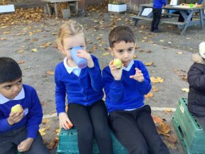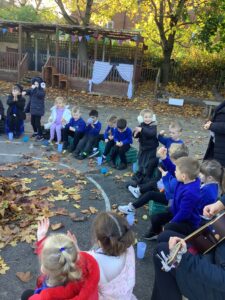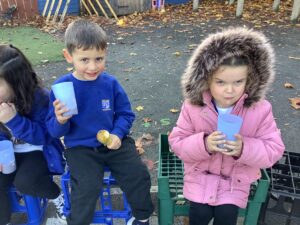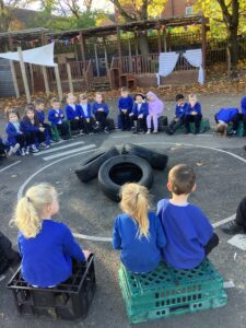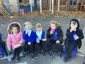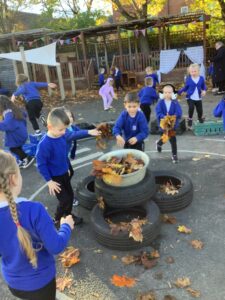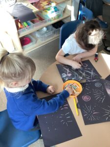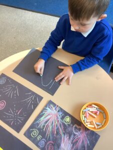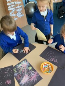 Throughout this week, Reception have been learning about bonfire night and all the things we can do to be safe. We made firework pictures using chalk, focusing on the different colours and shapes that they make in the sky. On Friday, we made our own bonfire out of leaves, we drank hot chocolate, sang songs and played a firework game.