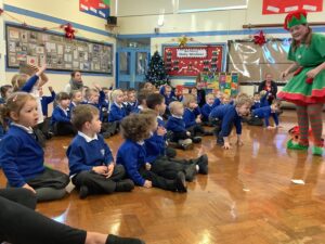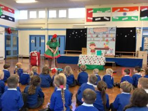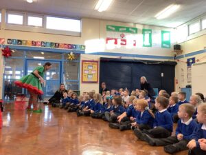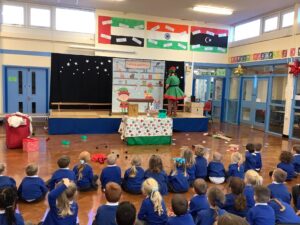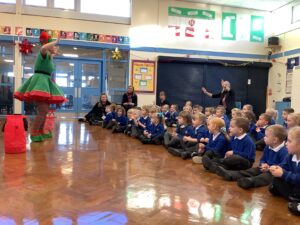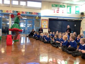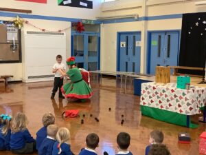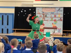Our Reception and Nursery children have had a fun filled morning watching The Clumsiest Elf show. They were a fabulous audience and joined in with dancing and actions when Effie (the elf) asked them to. As the title of the show suggests, Effie was really clumsy and kept tripping up which made us laugh!