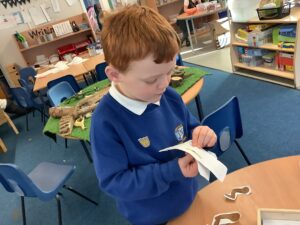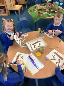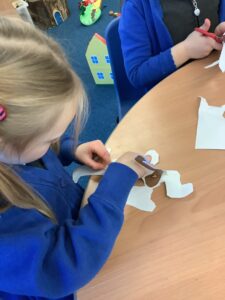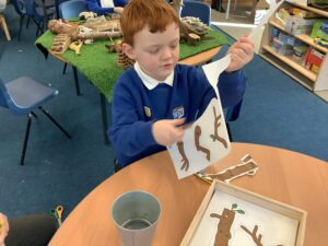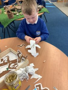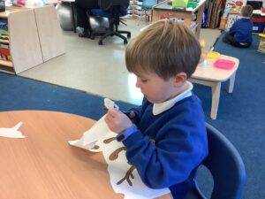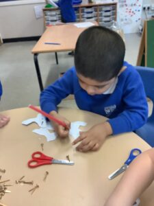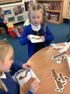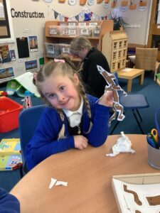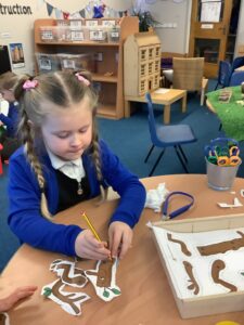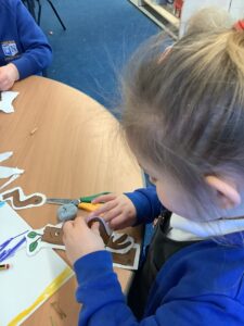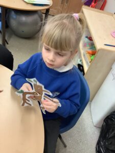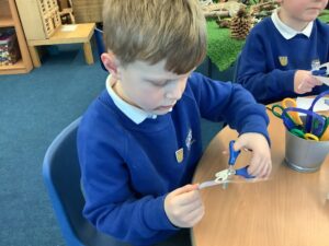 This week the children have enjoyed listening to the story ‘Stickman’ by Julia Donaldson. As part of their physical development children have been practising using scissors, the children showed great skill cutting around the different parts of the Stickman. They then used split pins to attach the parts together. Next week, the children will write a caption about their Stickman!