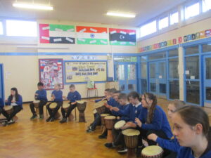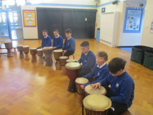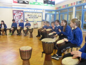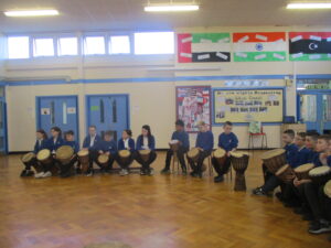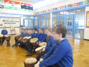 Today Year 6 had the opportunity to learn how to play the djembe, a West African hand drum. Fanuel, a drummer from Zimbabwe, came into school and taught us to play different rhythms on the drum. We learned how to create different pitch and volume by hitting different parts of the drum skin with different parts of our hands. He also spoke to us about the country he is from. Fanuel answered our questions as well as teaching us drumming. We really enjoyed our first session and can’t wait to learn more next week!
