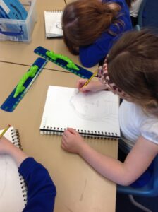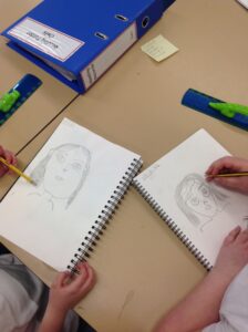 During their basic skills lesson Owls enjoyed a sketching lesson. They looked at sketching their head and face. First they talked about the different features on their face such as shapes and lines. Then they used a cross line effect to help them centralise their features of eyes and nose. They used a pencil softly and slowly to support their sketching.