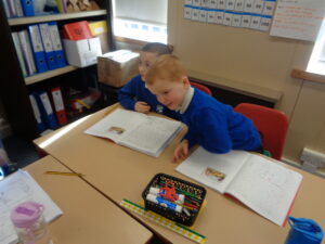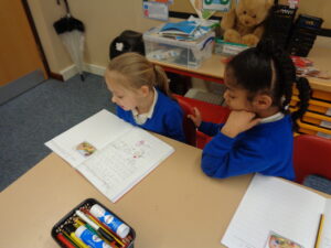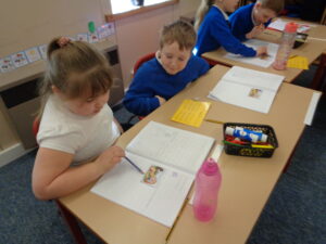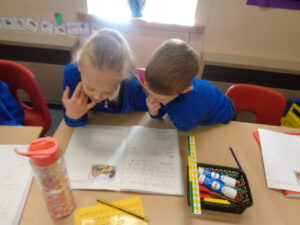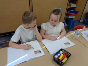 Today in the Bees the children have been creating questions and statements for one of the pictures from the traditional tales we have been reading this term. They shared their ideas with each other before writing them.