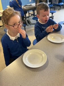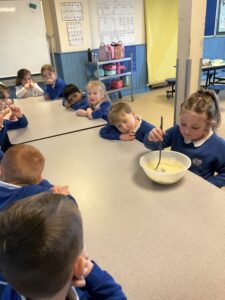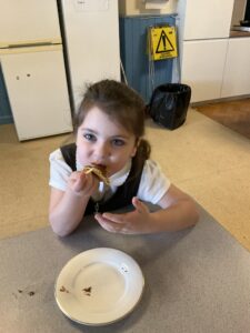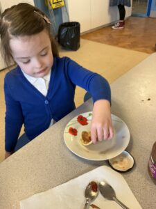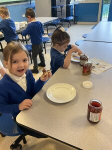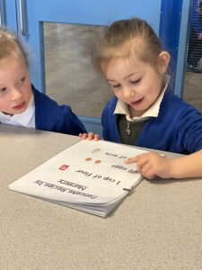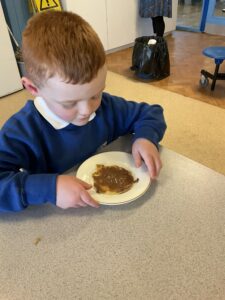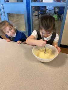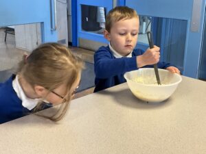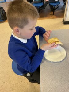 Linked to our text ‘Mr Wolf’s Pancakes’, we have been busy cooking our own pancakes. On Thursday, we used the recipe book that the Nursery children had made to find out what ingredients and equipment we needed. Then, we measured, mixed and cooked our pancakes noticing the changes that happened to the batter when it was heated. Finally, we chose which topping we would like and ate them all up!