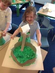 KS1 have enjoyed taking part in an after school history club. The children enjoyed making their very own Motte and Bailey castles linked to our topic ‘King of the Castle’. Over several weeks the children created the bailey with shredded paper and glue, a motte using paper mache and a plant pot and finally using corrugated cardboard to make fences and a bridge. They all had an amazing time and the end results were amazing!