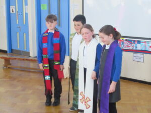 Today, Year 3 and 4 were lucky enough to have a visit from Reverend Danie. We learned all about clothing that people of Christian faith might wear. It’s not always easy to spot a Christian, as they are just like you and me! We found out that Christians quite often wear a cross around their neck, and can wear other Christian symbols too.