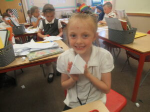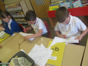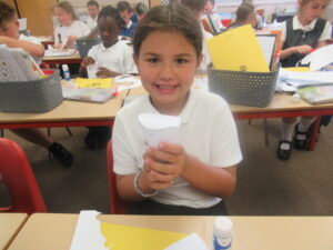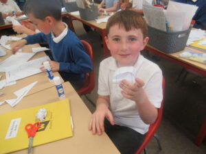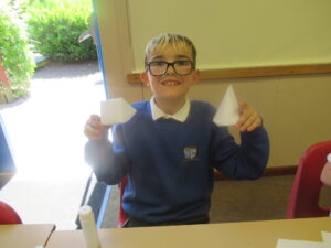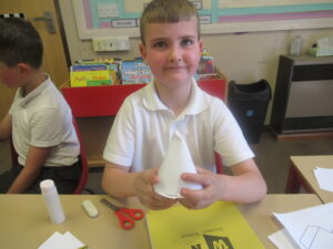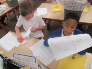 Last week, Bluebells were working on shape in maths. They looked at the difference between 2d and 3d shapes and identified their features: faces, edges, vertices and angles. On Friday, children used nets to build a range of different 3d shapes; it was a tricky job but it allowed the children to see how nets come together to make them.