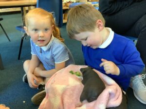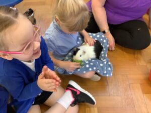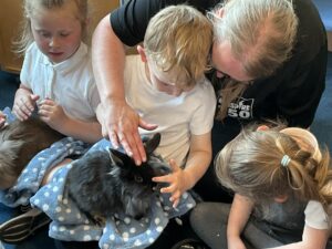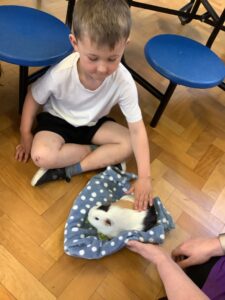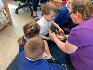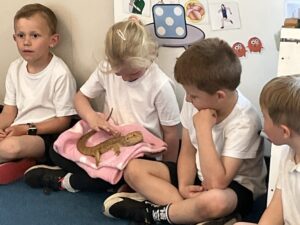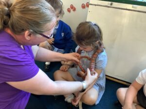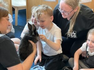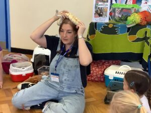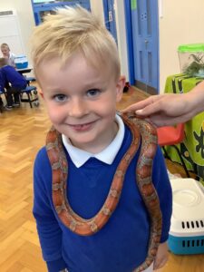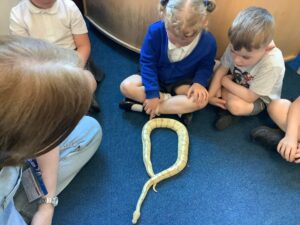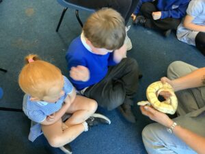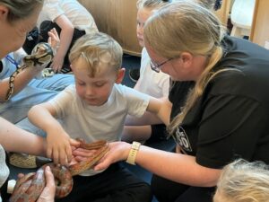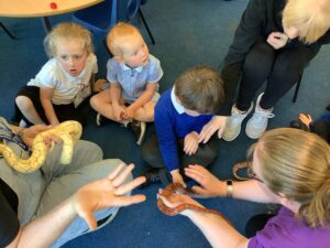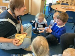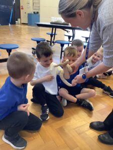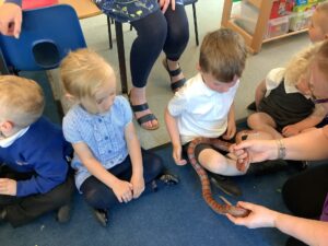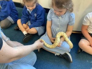 Angela introduced the children to all of her different animals these included skinny pigs, snakes, bearded dragons and rabbits to name just a few! The children listened carefully to how to hold the animals and learned some more information about their natural environments and details about each animal. All staff were so proud of how safe and brave the children were when handling the animals.