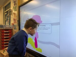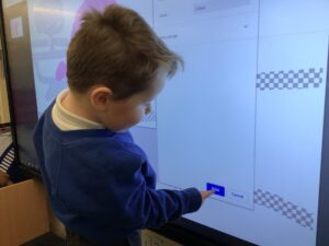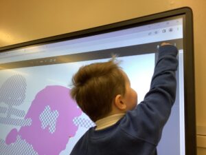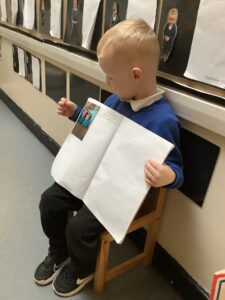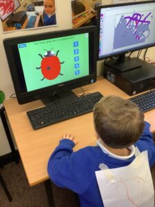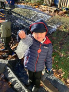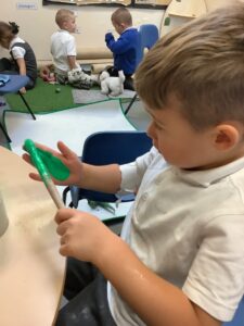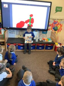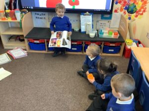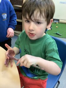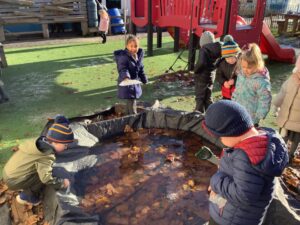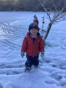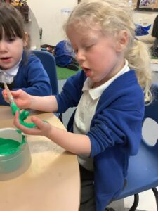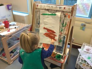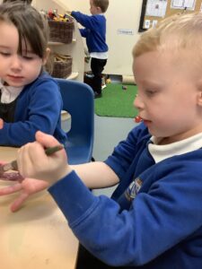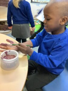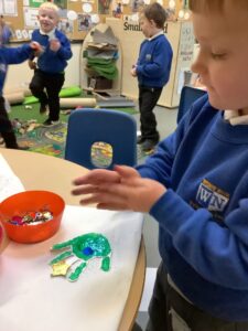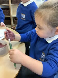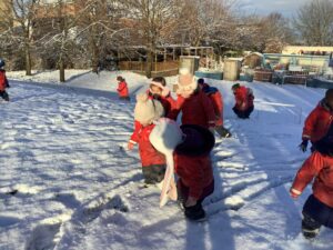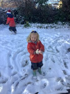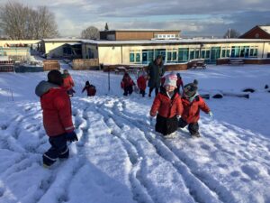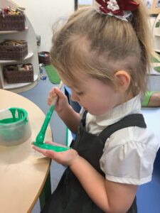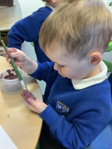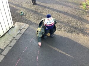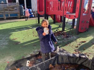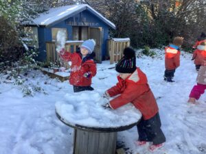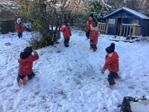 This week we have started to prepare for Christmas. We made some fantastic hats that we will wear during our Christmas performance. We chose to either make a Christmas tree hat or a reindeer. We used handprints for the main part of the hat and decorated them accordantly. We have been practicing for our Christmas performance and we climbed up onto the stage which was really exciting! We have continued to work on counting during our maths sessions this week. We have also continued to practice our cutting skills and participate in Squiggle While You Wiggle. Some of us loved spending time outdoors on Wednesday morning making the most of the covering of snow that we had. We made marks in the snow and experimented with some ice that had formed in various parts of our nursery outdoor area. During our Friday outdoor session we made the most of the snow again. We had great fun!