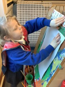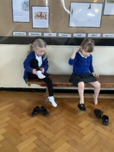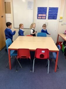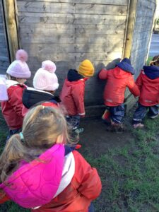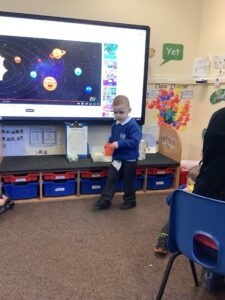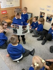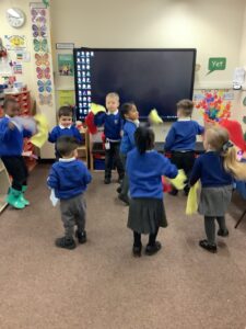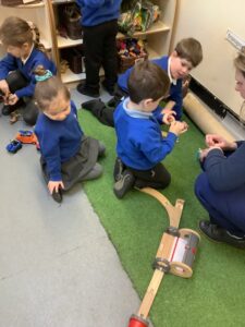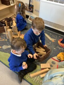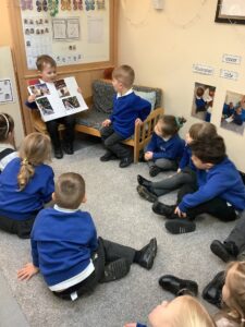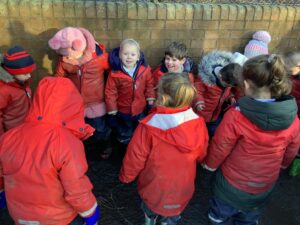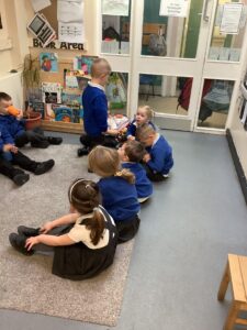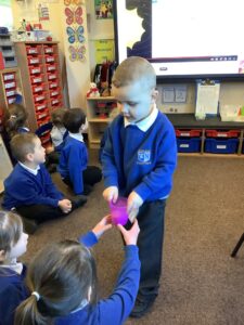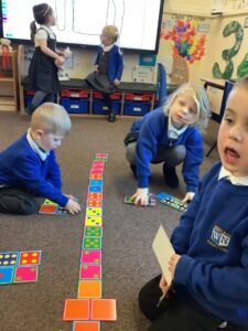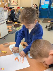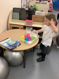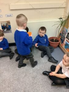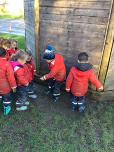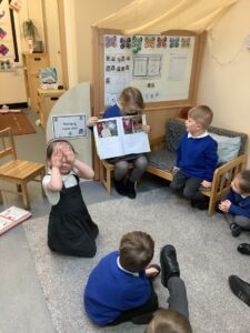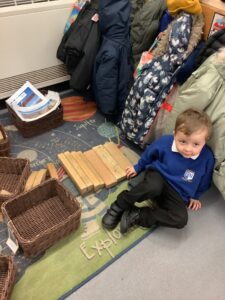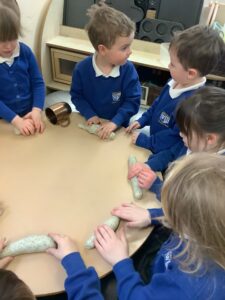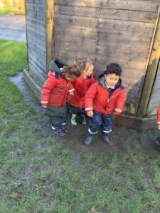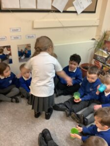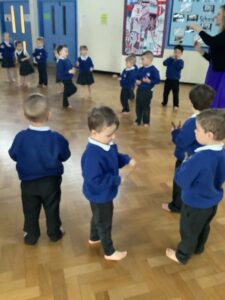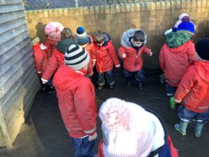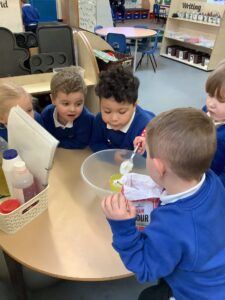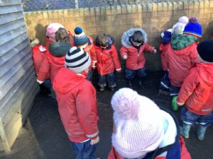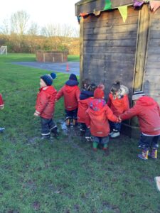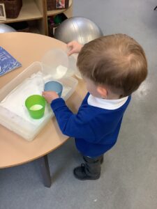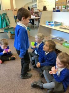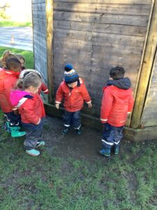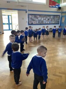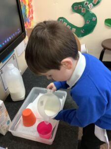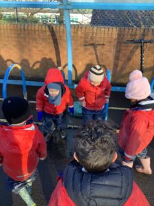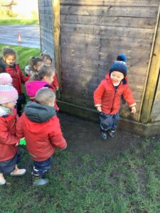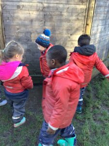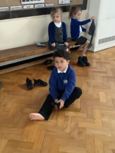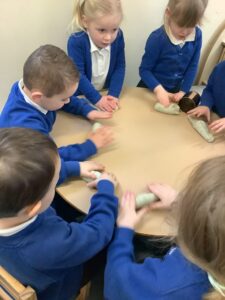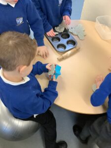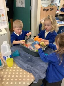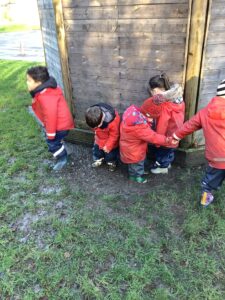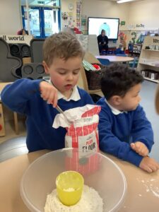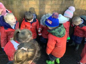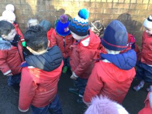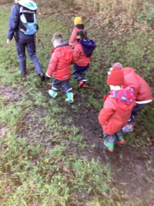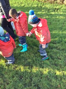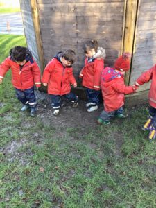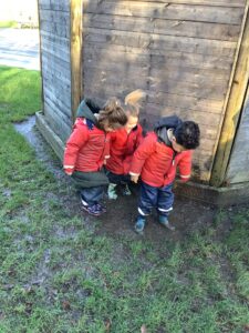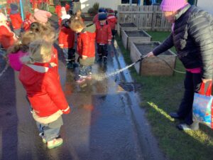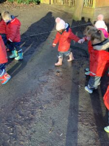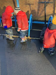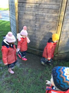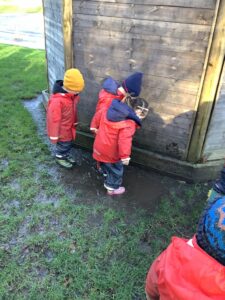 We made some more shimmering playdough this week following our playdough recipe. We carefully measured and counted the appropriate quantities of ingredients and practised good turn taking and patience while waiting for our turn. We have continued to focus on repeating patterns in maths using both indoor and outdoor materials. We worked on resilience and determination during a self-help session and practiced taking off and putting on our socks and shoes. We talked about making 2 as we paired our shoes together and described our shoes, comparing them to each others as we looked for similarities and differences. We completed some drawings of ourselves for our This is Me display. It was wonderful to see how much more detail the children now put into their self-portraits and theĀ progress they have made since September. During our Friday outdoor session we talked about the weather and the fact that it had rained a lot this week. We examined our school grounds for signs of rainy weather and discovered that the grass was really wet and muddy. We found some wonderful muddy puddles to jump in!