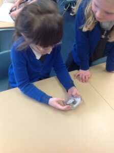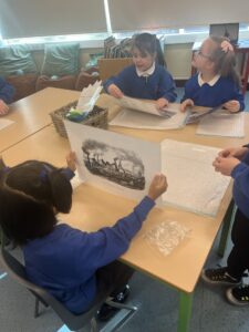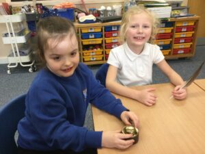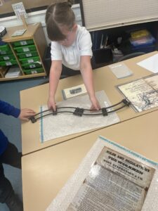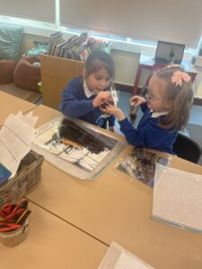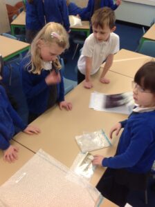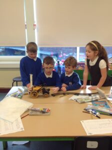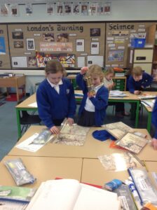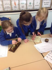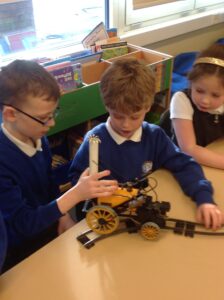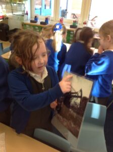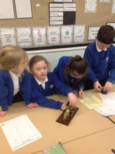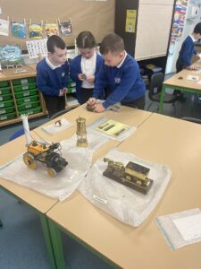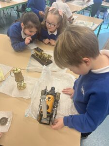 To support our learning for this half terms topic Trains, Planes and Automobiles the children were able to investigate a Box of Delights from the Discovery Museum. Inside the box were a variety of artefacts linked to George and Robert Stephenson. The children could hold a replica steam train, a Geordie lamp, coal, a pocket watch, look a different maps, photographs of George’s house in Wylam, different coal mines and a £5 note. Lots of questions were asked as the children were very inquisitive.