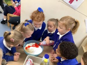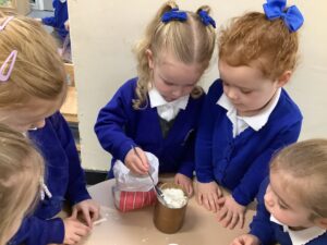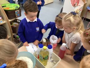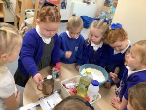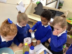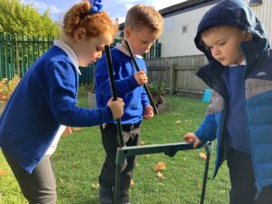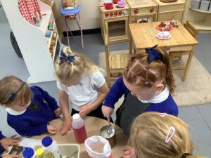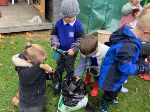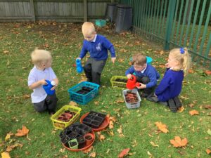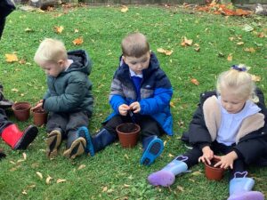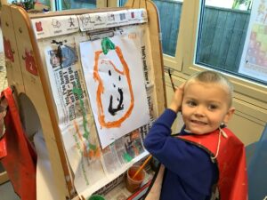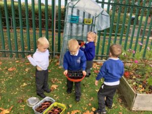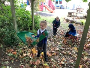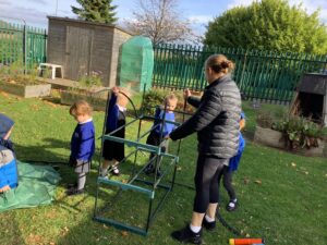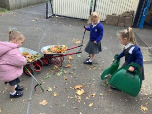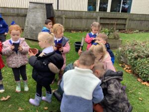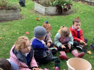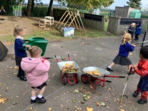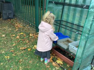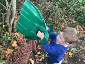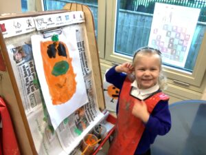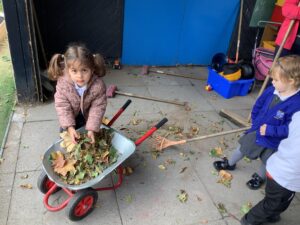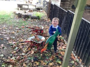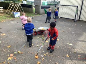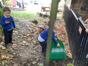 Outdoors, the children used our new leaf pickers and hand shovels to continue collecting autumn leaves, which were then composted in our leaf composter to support learning about recycling and caring for the environment. Indoors, we made orange playdough and used it to make pumpkins.