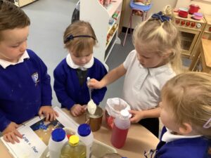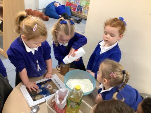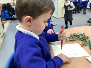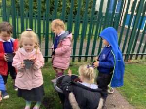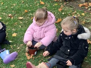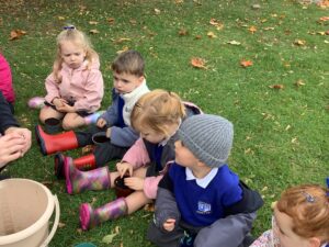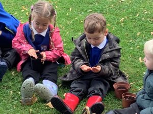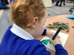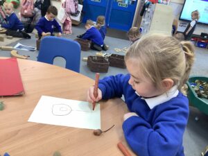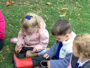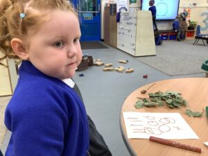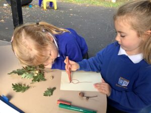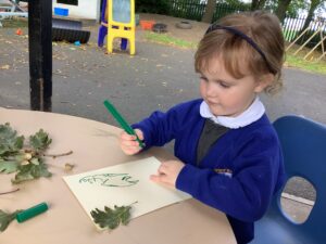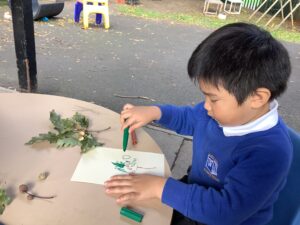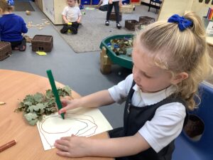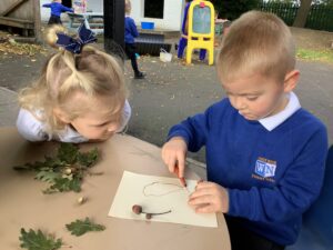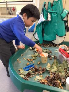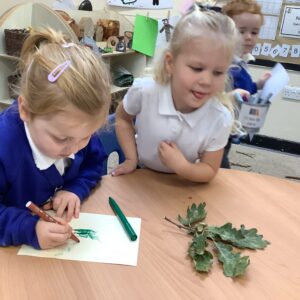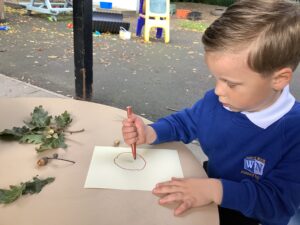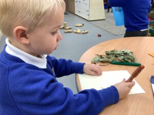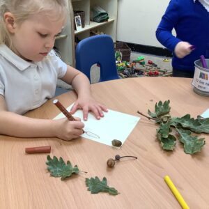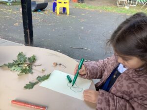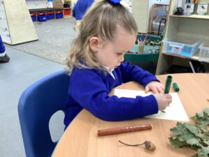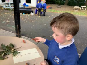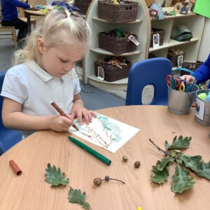 This week, our nursery children have been busy continuing their autumn topic with lots of hands-on exploration and creativity. They closely examined branches, leaves, and acorns collected last week, then created beautiful drawings for our oak tree wall display in the classroom. In maths, we used tweezers and tongs to count and sort the oak items into numbered containers—supporting number recognition and strengthening our hands.