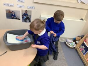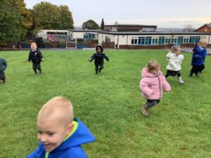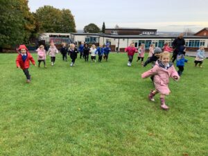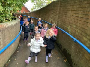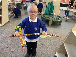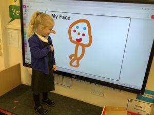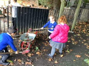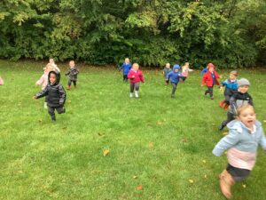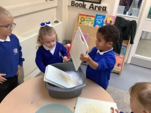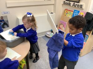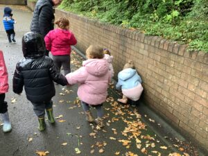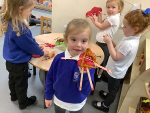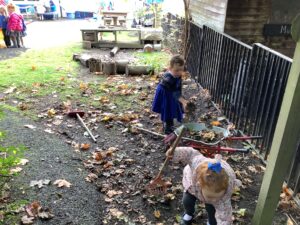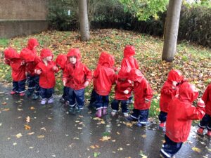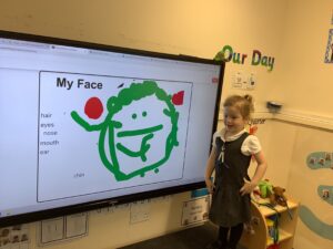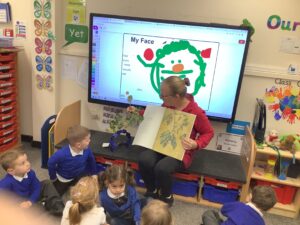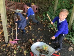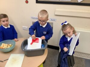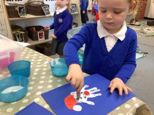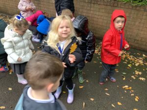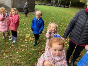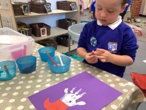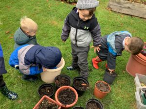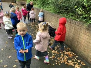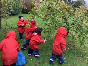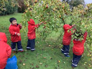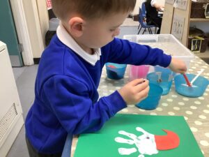 In our classroom, we’ve started a beautiful new Autumn display wall featuring photographs of the children engaging in seasonal activities like picking fruit, finding acorns, sweeping leaves, and adding them to our leaf composter. The children discussed what was happening in each photo and added their own ‘writing’ (mark making) on speech bubbles beside the images. The children also created festive Santa-themed Christmas card designs for Cauliflower Cards, a company that transforms children’s artwork into printed packs of cards, mugs, and other keepsakes.