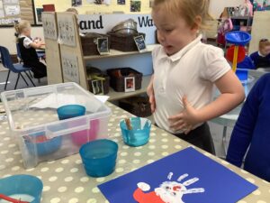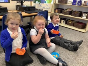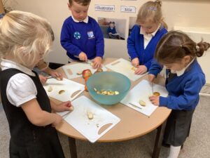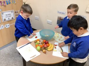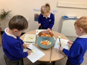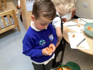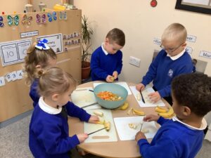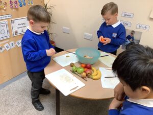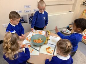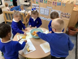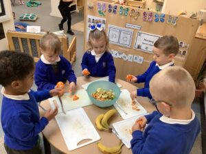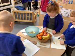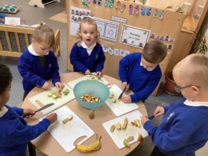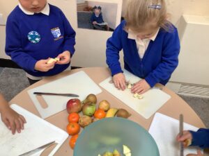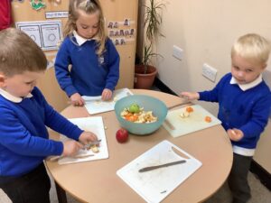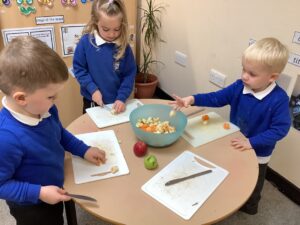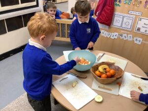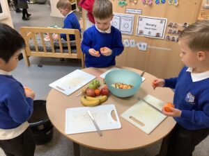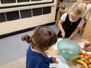 This week, we continued our focus on self-care and staying healthy. The children made a colourful fruit salad using pears and apples from our school fruit trees, along with oranges and bananas. We practised good hygiene by washing our hands before preparing food and learned about staying safe by only holding the handle of the knife while chopping. Everyone showed fantastic perseverance while chopping the tougher fruits like pears, and thoroughly enjoyed their fruit salad during snack time!