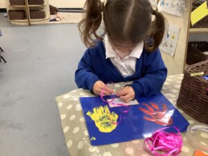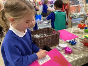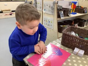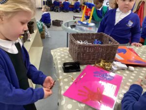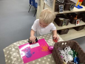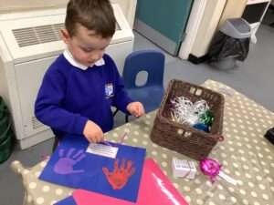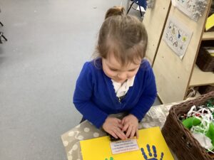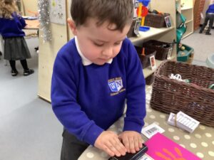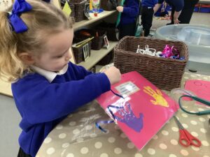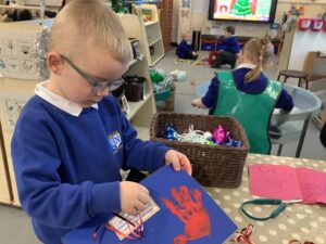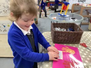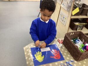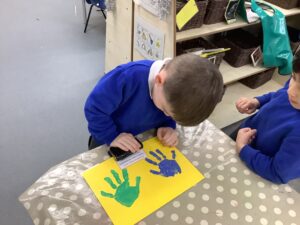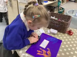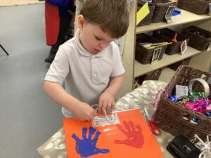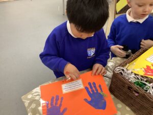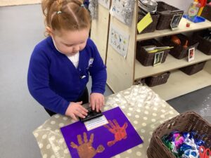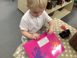 We have had a wonderfully creative and festive week in nursery! The children designed their very own calendars to take home as a keepsake for the year ahead. They began by choosing a coloured card for the base and selecting paint for handprints using both hands. Once the prints dried, we added a special poem and laminated the calendars to preserve their beautiful work. The children then threaded a ribbon through holes at the top so the calendar could be hung, and finally attached a calendar tab at the bottom. This activity encouraged decision-making, fine motor skills, and creativity while producing something families can treasure all year.