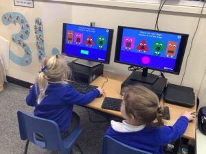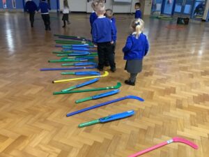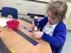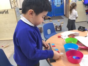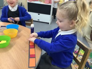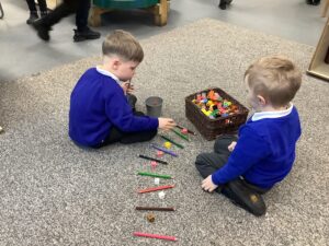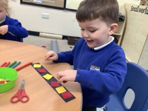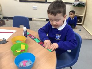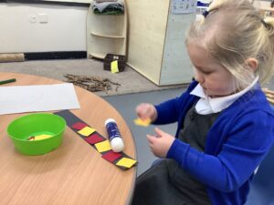 In our maths learning, the children explored repeating patterns through hands‑on and visual activities. During Outdoor Friday, we made a repeating pattern using long and short willow sticks, encouraging the children to look closely at length and order in a natural environment. Inside the nursery, the children worked together to create a bright and colourful display of shape repeating patterns using different card shapes, carefully selecting colours and arranging them in sequences. This helped develop their understanding of order and repetition while also supporting fine motor skills and growing confidence in making choices. The children also created and continued patterns on the interactive whiteboard, copying and building sequences in an engaging and visual way. Later, they used everyday classroom objects—such as blocks, counters and natural materials—to make their own patterns, experimenting independently and sharing ideas with their friends.