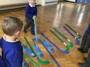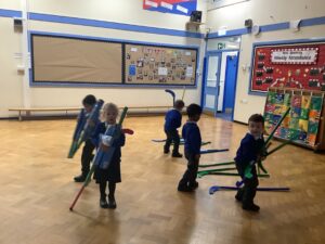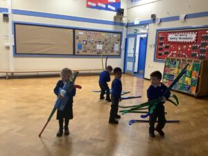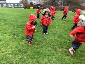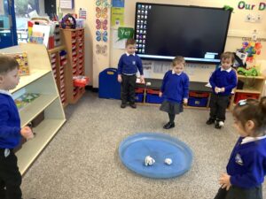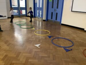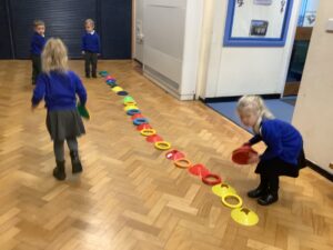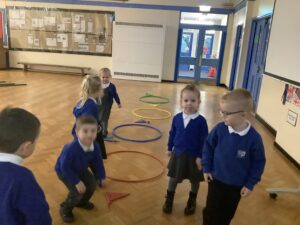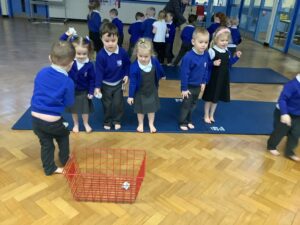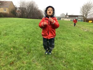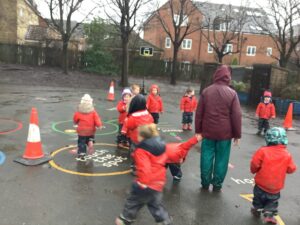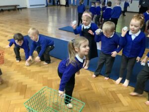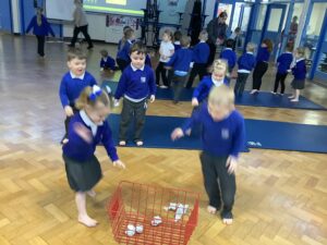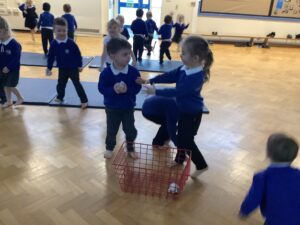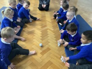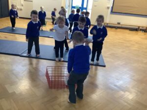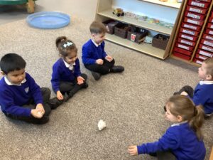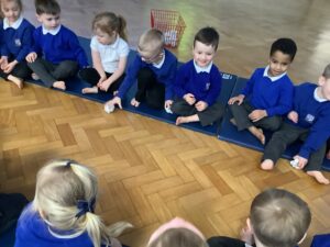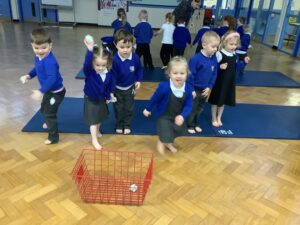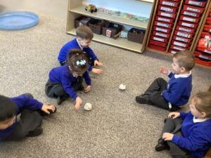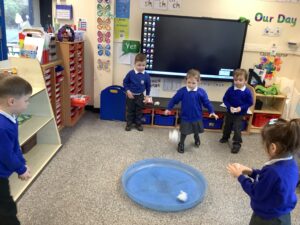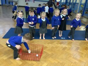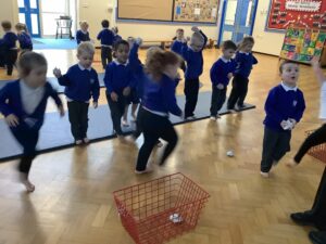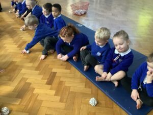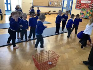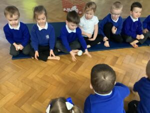As part of our physical development work, the children went into the hall and used their imaginations to transform a scrunched‑up white piece of paper into a snowball. They rolled and threw the ‘snowballs’ to each other, practising taking turns and using language such as their partner’s name and “Are you ready?” before passing. This activity supported coordination, control and cooperative play.